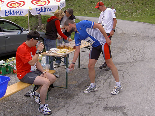 Ab dieser Verpflegungsstelle gab es Cola zu trinken, was wir natürlich sofort ausnutzten, denn jetzt wollten wir ja Tempo machen. Allerdings war uns klar, dass wir die fünf Stunden nicht mehr schaffen würden. Bis km 18 lagen wir mit 2:14 Stunden hervorragend in der Zeit, für die folgenden sechs Kilometer auf dem schlechten Wegstück über den Pass hatten wir, trotz keiner Steigung mehr, sage und schreibe 1:04 Stunden benötigt. Diesen Verlust konnten wir auf den restlichen 18 Kilometern wohl kaum mehr wettmachen. Rechnerisch wären das ja 1:48 Stunden gewesen, auf einem Flachstück kein Problem, aber hier?