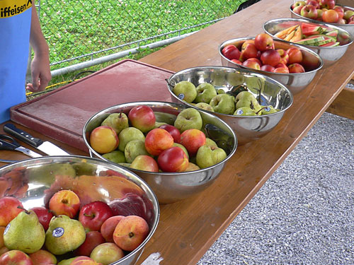 Wunderschöner Lauf, beste Verpflegung unterwegs mit freundlichem Personal, hervorragendes Wetter, aber die Krönung kam am Schluss. Noch nie habe ich bei einem Lauf eine reichhaltigere und vor allem liebevoller arrangierte Verpflegung im Ziel erlebt! Große Auswahl an Getränken, aber auch an Obst. Das Obst lag aber nicht einfach in Schachteln, sondern wurde dekorativ in Edelstahlschüsseln angeboten, mit Wasser bespritzt, so dass die Äpfel, Nektarinen und Birnen auch überaus appetitlich aussahen. Hätte man Aufnahmen für ein Magazin machen wollen, viel hätte man da am Arrangement nicht ändern müssen. Auf einem dritten Tisch standen Papiertüten, in jeder ein Laib Vollkornbrot. Als ich mich erkundigte, was das kosten würde, bekam ich zur Antwort: „Nichts, einfach nur mitnehmen!“ Großes Kompliment an die Organisatoren!