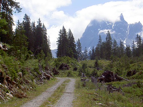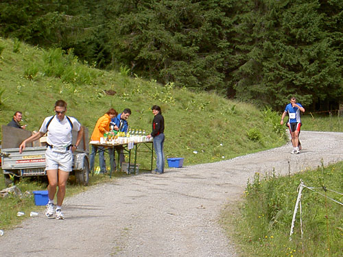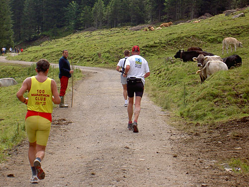 Der Wald war lichter geworden, immer wieder waren jetzt auch mal Alpen neben uns auf denen Kühe weideten, der Weg verlief jetzt flacher. Kilometer 18 hatten wir passiert und nur noch 4 Kilometer trennten uns vom höchsten Punkt, dann würde es runter gehen. Unsere Kilometerzeiten lagen bisher zwischen 7 und 9 Minuten, wir fühlten uns noch bestens, eine Zielzeit von unter 5 Stunden war also durchaus realistisch. Aber dann kam es ganz anders als geplant!