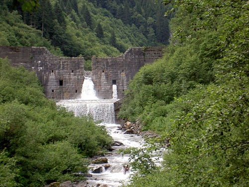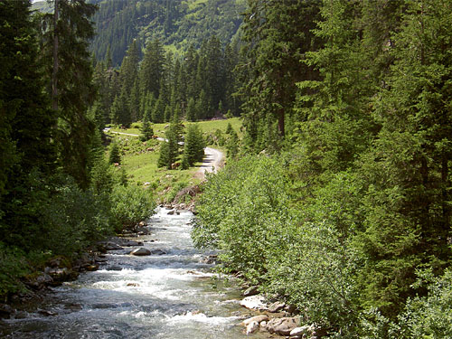 Natürlich war es nicht eben, wie es das Höhenprofil suggerierte, sondern es ging knapp zwei Kilometer sanft bergab, dann in einer 360 Grad Wendung wieder zurück zum Startbereich, jetzt aber hoch, mal sanft, mal etwas stärker – die ersten Geher überholten wir schon. Bei Kilometer vier dann liefen wir wieder durch den Startbogen, diesmal in die andere Richtung. Noch knapp einen Kilometer einigermaßen eben und dann begannen die 17 Kilometer ständiges bergauf. Nun, 1.000 Höhenmeter auf 17 Kilometer verteilt müssten ohne Gehpausen zu schaffen sein und in der Tat war die Steigung immer so, dass ich joggen konnte. Der Weg war gut, ein breiter, gekiester Forst- und Wirtschaftsweg im Wald, links neben uns ein Gebirgsbach, die Steigung wie erwartet, mal nahezu eben, dann wieder steiler. Irgendwann, vielleicht bei Kilometer 10, kam das steilste Stück der Strecke, wie uns ein Läufer aus Silbertal erklärte. In der Tat war ich da beinahe versucht, ins Gehen zu verfallen. Weil ich mir aber vorgenommen hatte, alles zu joggen, ließ ich nicht nach und nach einem Kilometer wurde es auch wieder angenehmer.