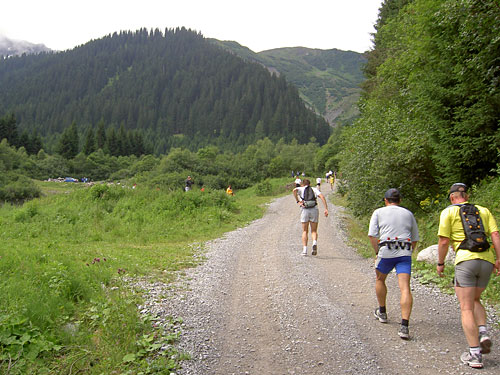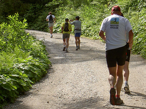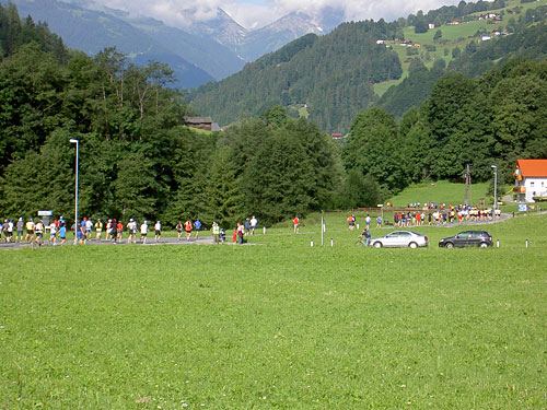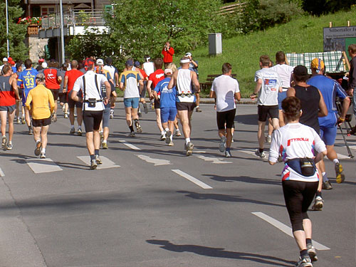 Pünktlich um 9 Uhr war Start. Klaus hatte etwas Bedenken, weil seine rechte Wade, die ihm schon in Zermatt Probleme bereitet hatte, immer noch nicht ganz in Ordnung war. Er wollte aber trotzdem, wie ich auch, die Strecke ohne Gehpausen durchlaufen. Wir begannen verhalten, liefen von Anfang an unser Tempo (6:20 min/km) und ließen uns auch nicht irritieren, dass wir bald ziemlich hinten im Feld waren – wie immer überschätzten sich da wohl einige, die wir dann sicher noch überholen würden, wenn es mal eine Zeitlang hoch ging.