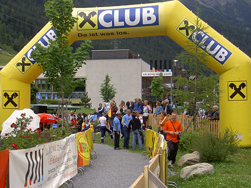 Endlich mündete der Pfad in einen breiteren Weg, der uns die nächsten beiden Kilometer recht ordentlich bergab führte. Klaus war bereits vor einigen Kilometern etwas zurückgefallen, er musste seine Wade schonen. Ich lief immer noch so schnell ich noch konnte, ich wollte sehen, ob ich auch noch gegen Ende mein Tempo halten konnte. Seit einiger Zeit war ich in Gesellschaft von zwei Läufern, einer meist hinter mir, der andere vor mir. Ich versuchte den vorderen einzuholen, aber immer wieder konnte er sich absetzen. In einigem Abstand rannten wir also jetzt etwa zwei Kilometer bergab, bis wir St. Anton erreicht hatten. Hoch oberhalb hatten wir auf dem Pfad den kompletten Ort passiert, jetzt mussten wir in St. Anton wieder zwei Kilometer zurück bis zum Ziel. Alle drei waren wir ziemlich erschöpft, mobilisierten jedoch noch Kräfte und konnten die letzten beiden Kilometer noch deutlich schneller als 6 min/km laufen. Keiner konnte sich mehr entscheidend absetzen und so liefen wir gemeinsam ins Ziel.