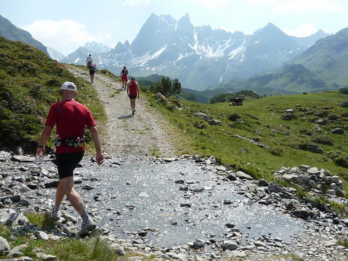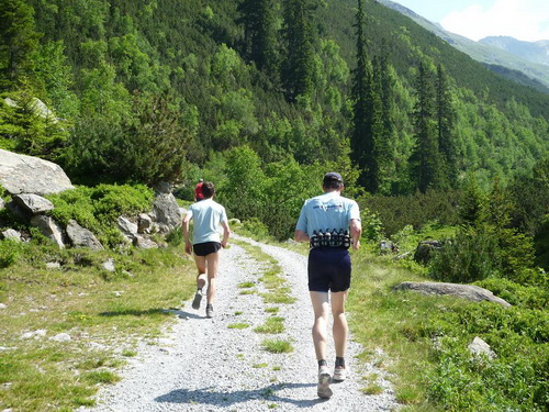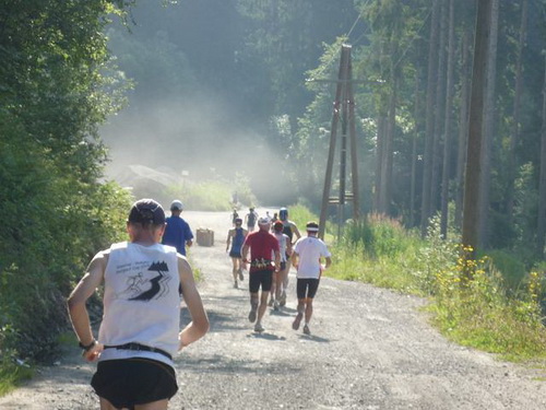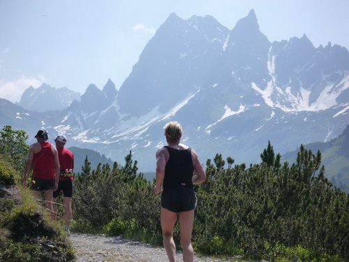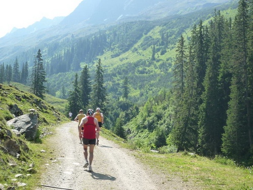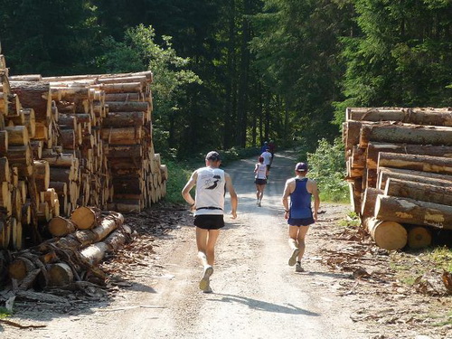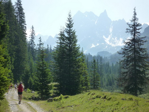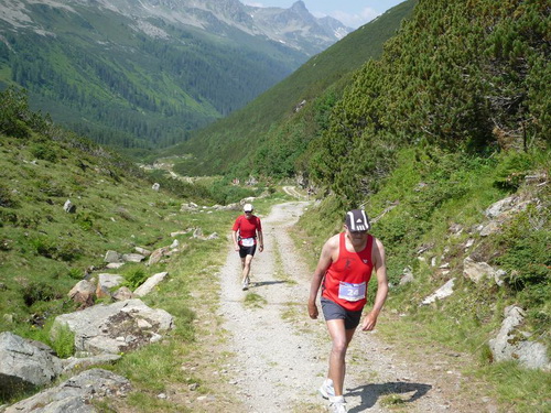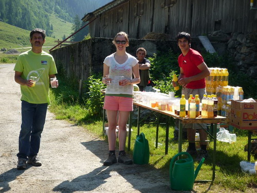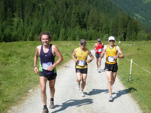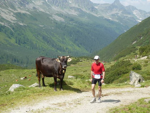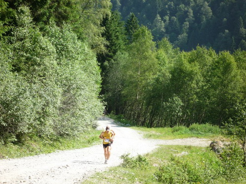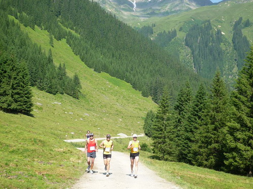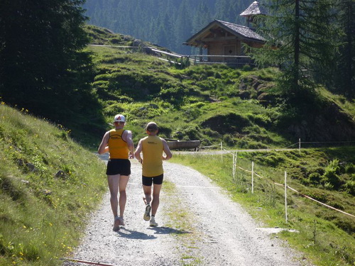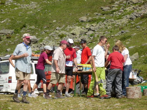 Schon bald wird der Wald lichter und macht Platz für saftig grüne Almen mit kleinen verträumten Almhütten. Zunehmend eröffnet sich dadurch der Blick auf die umgebende Bergwelt, die hier noch sanft und rund wirkt. Das offene Gelände hat nur einen Nachteil: Die Sonne brennt ungehindert auf uns nieder und der Schweiß fließt in Strömen. Etwa alle drei km ist jedoch eine Versorgungsstation aufgebaut, wo wir unseren Flüssigkeitsverlust kompensieren können. Das Läuferfeld hat sich schnell so weit auseinander gezogen, dass es an den Stationen äußerst entspannt zugeht. So klein die Versorgungsstationen auch sind: Das Angebot ist vielfältiger als bei ei so manchem deutlich größeren Lauf. Neben Wasser pur gibt es Isogetränke und diverse Säfte (eigengetestet: Johannisbeer-Traube in magenfreundlicher Verdünnung), später auch Cola, für den Hunger Bananen-und Apfelstücke, Müsliriegel und Waffeln. Überaus freundliche und engagierte Helfer/innen kümmern sich um jeden einzelnen Ankömmling.