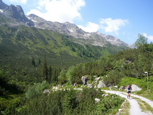 Statt hoher Tannen wachsen schließlich nur noch niedrige Kiefern und wenig später nur noch vereinzelte Büsche in der weiten, felsdurchsetzten Graslandschaft. Vor uns rücken die schroffen, teils schneebedeckten Berge der Verwallgruppe zunehmend ins Blickfeld und verstärken den Eindruck des hochalpinen Geländes.