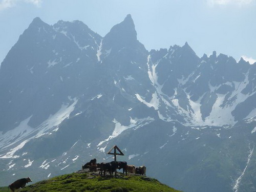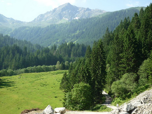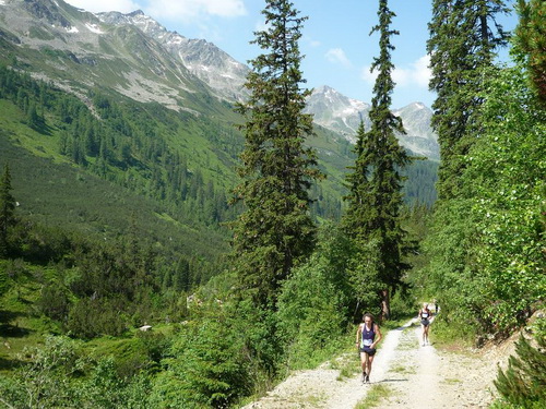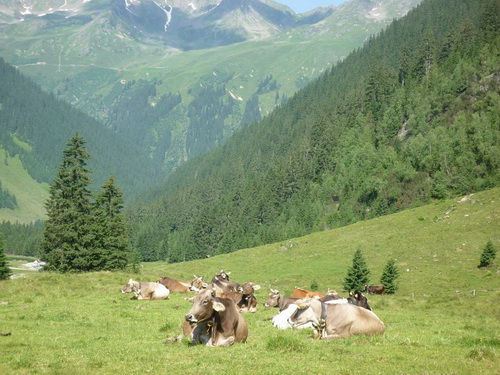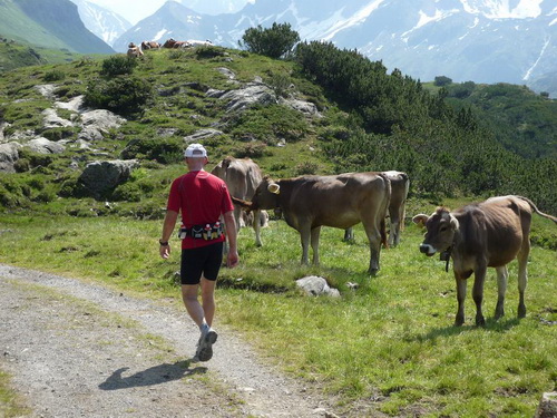 Immer weiter stoßen wir in die Höhe vor, immer lichter und niedriger wird der Wald, immer weiter reicht der Blick in und über die Bergwelt am Horizont. Friedlich grasen wohlgenährte Kühe am Wegesrand und nehmen kaum Notiz von uns. Ich genieße die Alpenidylle in vollen Zügen, auch wenn mir die Steigungen zunehmend zu schaffen machen. Mit zunehmender Höhe wird es andererseits auch ein wenig kühler, ein leichter Wind weht. Der Forstweg ist schmaler und holpriger geworden, aber nach wie vor bestens zu belaufen.