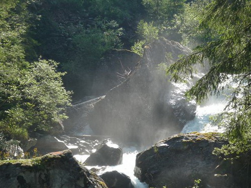 Die Asphaltstraße und damit der öffentlich befahrbare Teil des Tales endet kurz darauf und es geht auf einem zunächst breiten Forstweg weiter. Dichter schattiger Wald umgibt uns. Mal neben, mal unter uns rauscht die Litz im Talgrund. Mit wilder Kraft stürzt sie an einigen Stellen in Wasserfällen durch Fels und urwaldartig wucherndes Grün. Im Sonnenlicht glänzt die Gischt. Beeindruckend ist vor allem das Schauspiel der Giesla Wasserfälle etwa bei km 12.