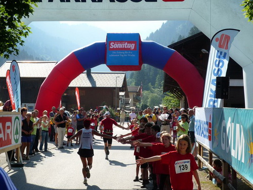 Wahre Hochstimmung erwartet uns vor dem Feuerwehrhaus. Es sind vor allem die vielen auf den später startenden Kinderlauf wartenden Kids, die uns lautstark empfangen und ihre Hände zum Abklatschen herausstrecken. Zum zweiten Mal durchlaufen wir den Startbogen und dürfen uns an einer Verpflegungsstation gleich ein erstes Mal stärken. Das ist auch sinnvoll: Denn nun stehen uns 18 km Anstieg durch den hinteren Teil des Silbertals bevor.