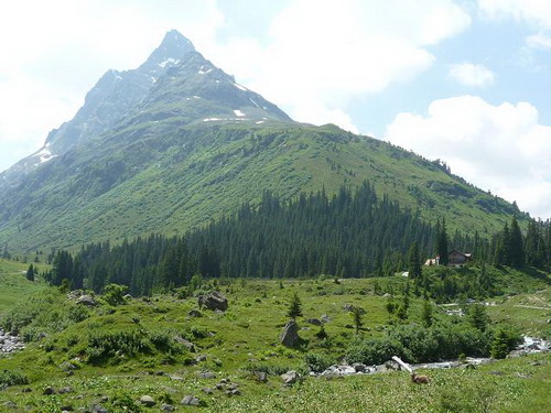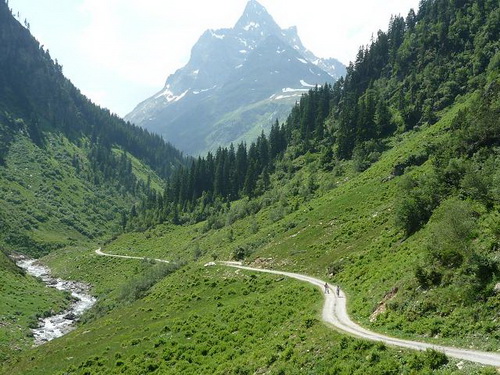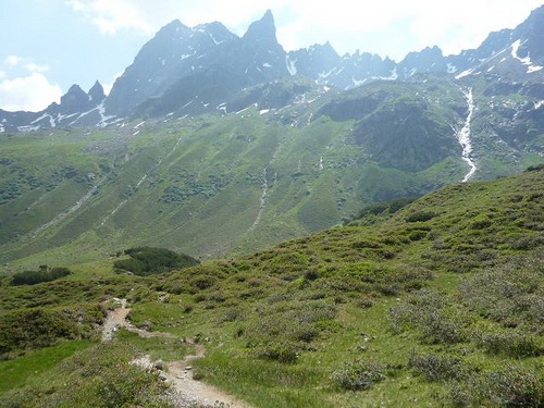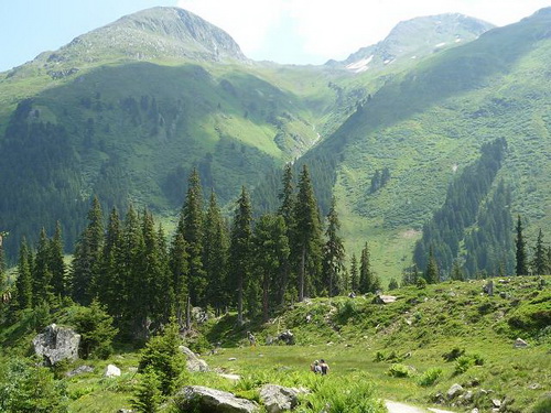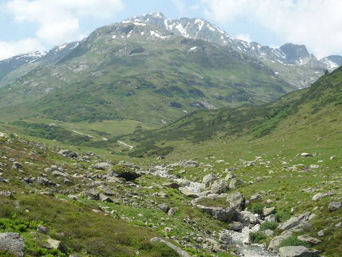 Schier endlos erscheint der Schotterweg, der sich nun in sanften Kurven hinab in das weite Verwalltal windet. Erst weit weg am Horizont verliert er sich im Grün des Waldes. Ein ganz neuer Panoramablick breitet sich vor uns aus, neue Gipfel tauchen in der Ferne vor uns auf. Ein Meer gelber Schlüsselblumen, durchbrochen von Felsbrocken und Farninseln, bedeckt die weiten Hänge des offenen Geländes um uns herum. Das Massiv des Patteriol zieht langsam rechts an uns vorbei und türmt sich schließlich nur noch hinter unserem Rücken in der Ferne auf.