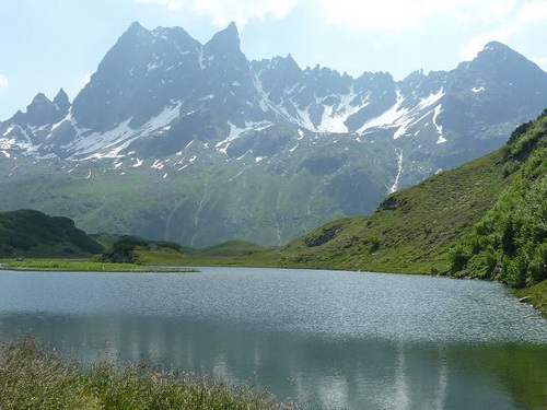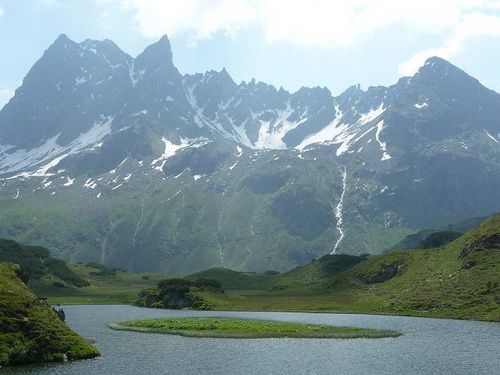 Dazu die überwältige Bergkulisse: Überaus beeindruckend ist der Anblick des sich monolithisch vor uns auftürmenden Felszacken des Patteriol, der mit seinen 3056 Höhenmetern der markanteste und gewaltigste Berg der Verwallgruppe ist. Inmitten der kargen Weite der Grasmatten passieren wir den Langen See, der sich malerisch vor der Kulisse der schroffen Berge abhebt.