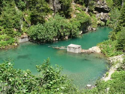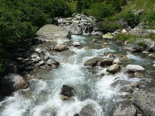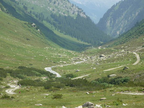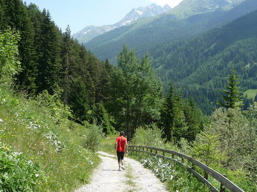 Allmählich verengt sich das Tal, die Baumdichte nimmt zu. Immer näher rückt die in der Talsohle rauschende Rosanna (welch ein schöner Name für einen Gebirgsbach!). Aber jetzt kommen auch die bereits erwähnten Zacken im Streckenprofil: Auf dem Plan klein und harmlos, in der Realität, gerade bei der Hitze, richtig fies. Vor allem der Anstieg bei km 28 lässt mich nur noch so dahin schleichen.