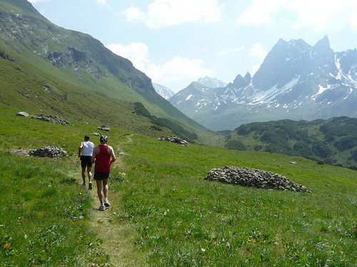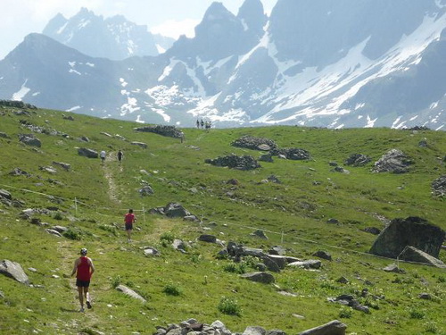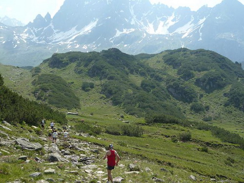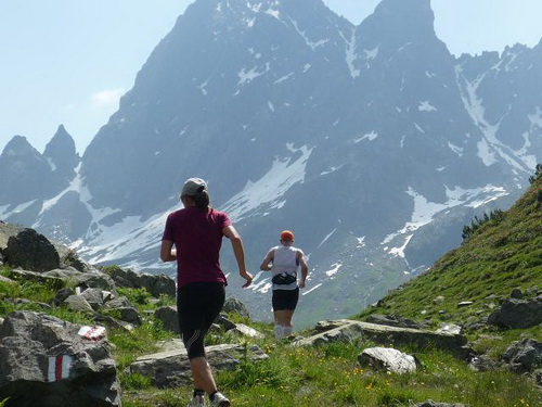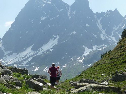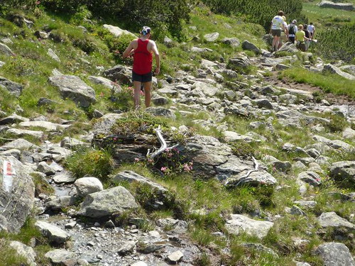 Unser Weg mutiert auf den nächsten 4,5 km zum Bergpfad. Wobei die Bezeichnung Pfad bisweilen fast schon beschönigend ist: Eine Melange aus Matsch und Gras, Wasser und Fels bildet unsere Laufunterlage und macht das zügige Vorankommen zur echten Herausforderung. Bäche fließen durch oder auch auf dem Weg. An manchen Stellen ist der Weg für mich nicht zu erkennen und ich gerate nicht nur einmal in die “Pampa”. Man muss permanent darauf aufpassen, nicht umzuknicken, abzurutschen oder zu stolpern. Und dennoch: Dieser Trail ist das absolute Highlight der gesamten Strecke. Ebenso herausfordernd wie traumhaft schön. Hier vereinigen sich all die eingangs erwähnten Attribute, die das Berglauferlebnis so einmalig machen. Wie einsame Gämsen hüpfen die Läufer von Stein zu Stein, binnen Sekundenbruchteilen jeweils entscheidend, wo der Fuß den nächsten sicheren Tritt findet. Meistens gelingt es, manchmal aber auch nicht - und der Fuß sinkt ein im moorigen, feuchten Untergrund.