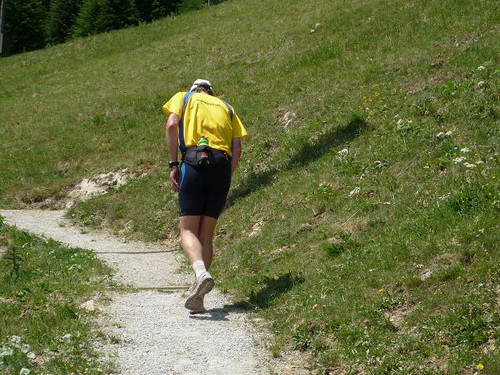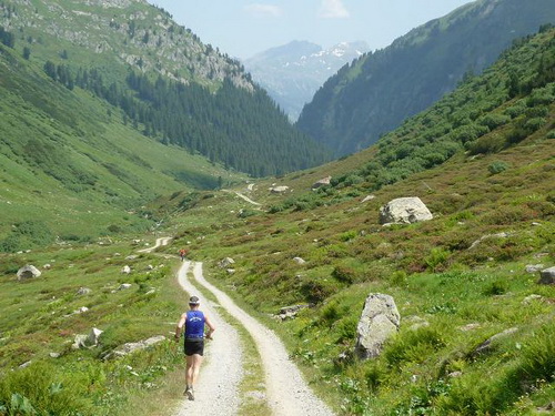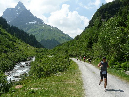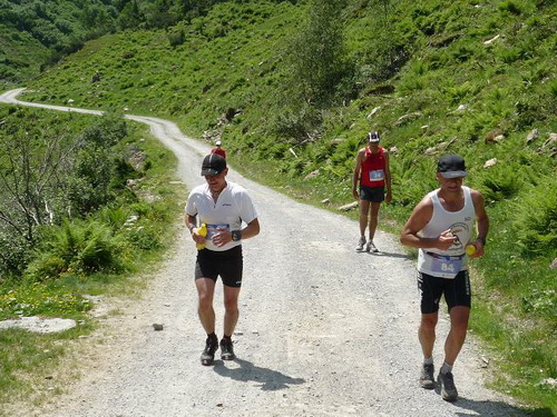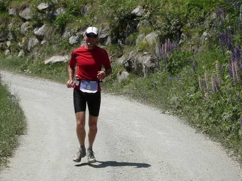 Zunächst geht es eigentlich sehr angenehm permanent leicht bergab. Dennoch ist der Lauf auf einmal für mich nicht mehr ein ungetrübter Genuss: Der große Schweiß- und damit verbundene Salzverlust äußert sich in einem krampfdrohenden Ziehen in den Waden. Durch Überdehnung bereits während des Laufs schaffe ich es aber irgendwie, eine weitere Eskalation zu vermeiden. Doch weiterhin gnadenlos brennt die Sonne auf uns herab; kaum ein Lüftlein weht im geschützten Tal.