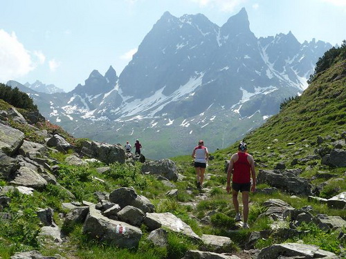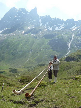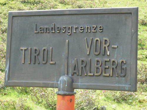 Bei Km 22 ist das Silbertaler Winterjöchle (1945 m üNN) und damit der höchstgelegene Punkt der Strecke erreicht. Wir passieren den einsamen Grenzpfahl zwischen Vorarlberg und Tirol. Zwei Alphornbläser lassen Ihre Instrumente in der Bergeinsamkeit erklingen. Auch daran merkt man: Die Schweiz ist nahe.