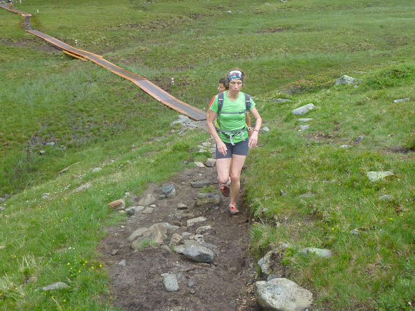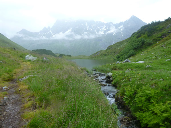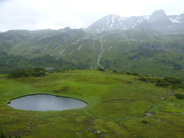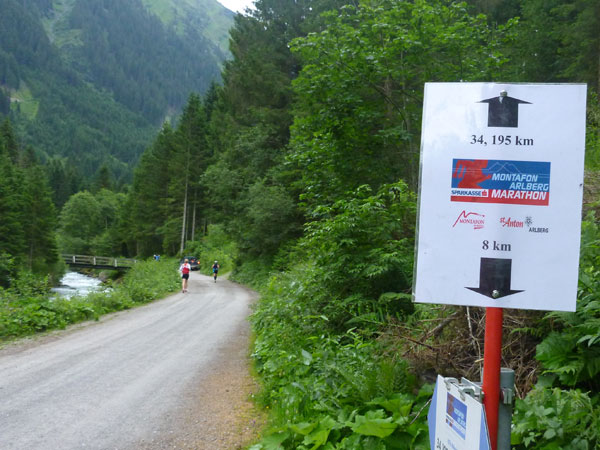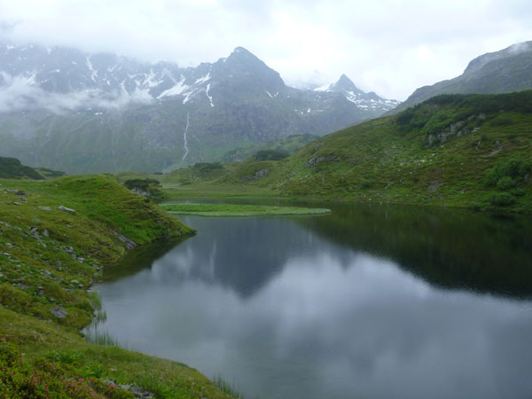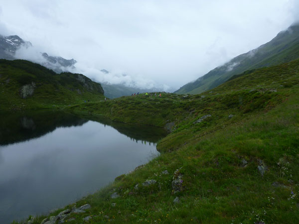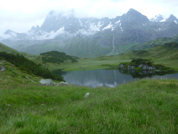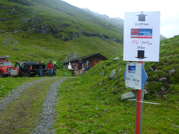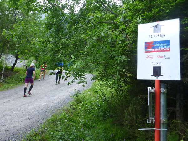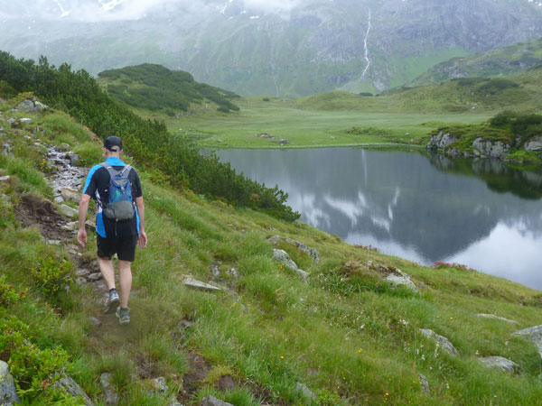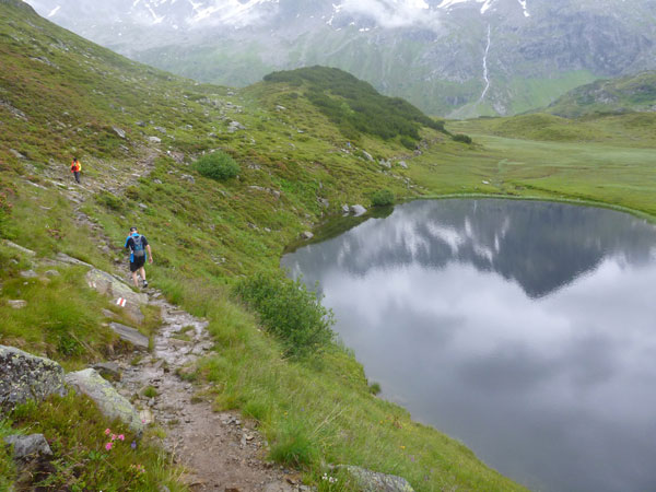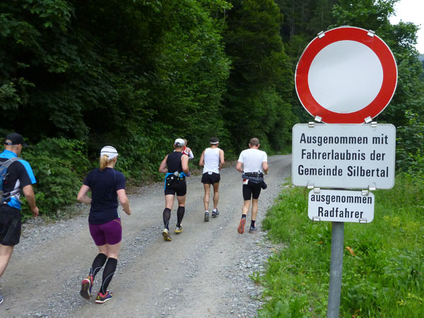 Kurz nach der Unteren Freschalpe (km 15), wo bereits die 4. VP auf uns wartet, passieren wir den Schwarzsee. Der hätte leckere Regenbogenforellen im Angebot, da dürfen aber nur die Mitglieder des Fischereivereines Montafon ran. Irgendwie verstehe ich persönlich die Fischer ja nicht: Erst setzen sie die Fische ein und dann holen sie sie äußerst gewaltsam wieder raus. Oberhalb des Sees wird es spürbar steiler, viele wechseln hier, wie ich, immer mit Marschieren ab.