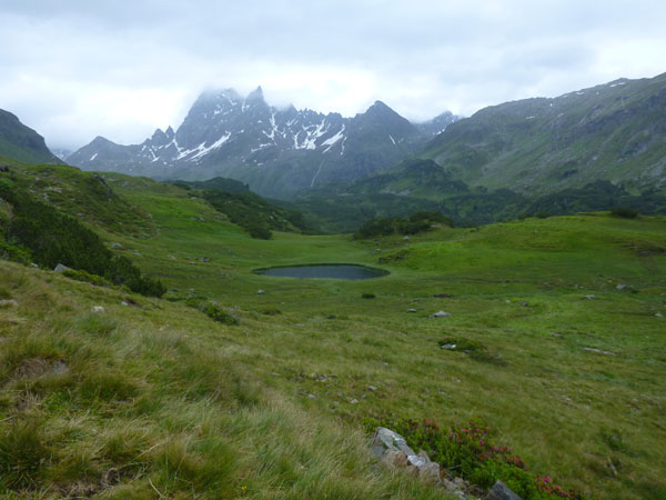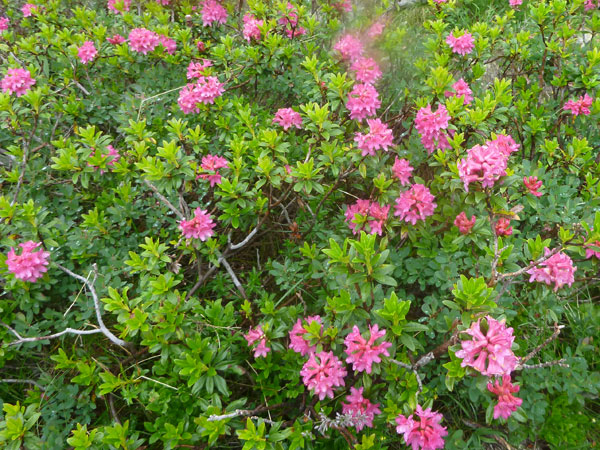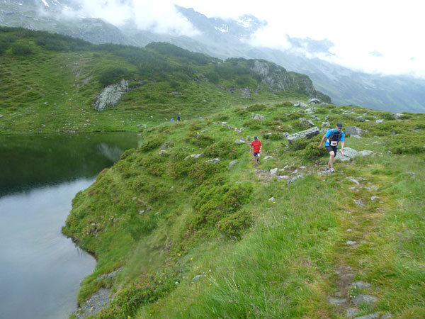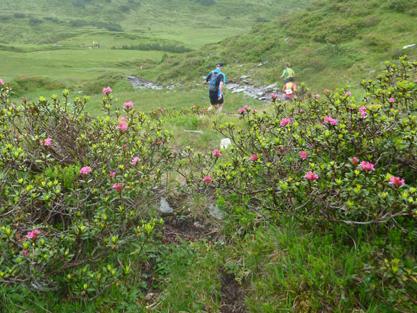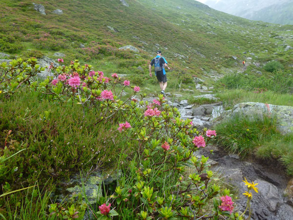 Weiter unten sind keine Kühe mehr, dafür wird es steiniger und es gibt jetzt bis zum Langen See unzählige Wasserlöcher und Rinnsale zu durchqueren. Durch prachtvoll blühende Alpenrosenfelder passieren wir in voller Länge den Moorsee. Wem bei der fantastischen Aussicht, der Blütenpracht und dem irren Trail nicht das Herz aufgeht, dem kann ich leider auch nicht weiterhelfen, zumindest kann derjenige kein Freund des Trailrunning sein.
