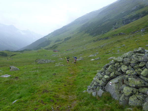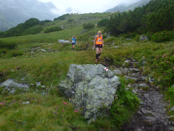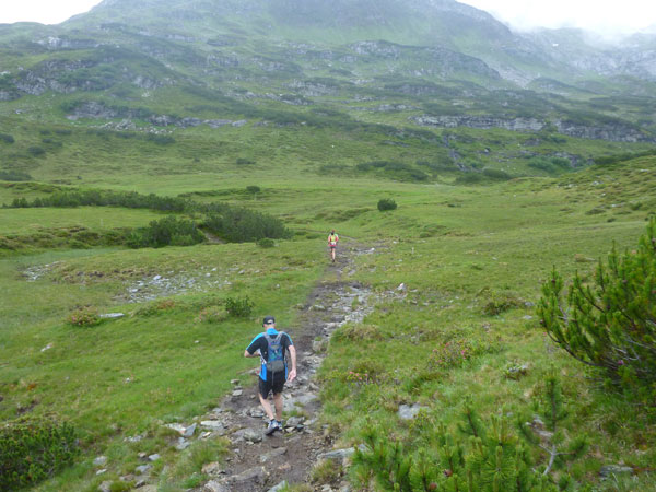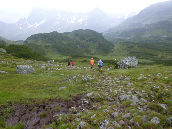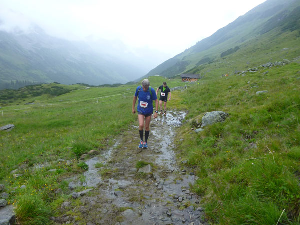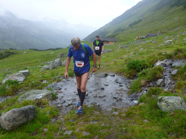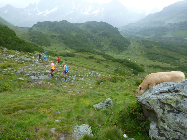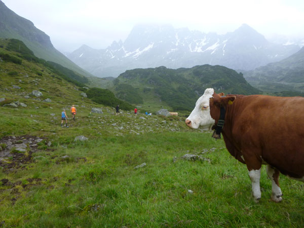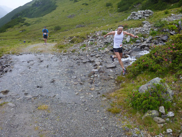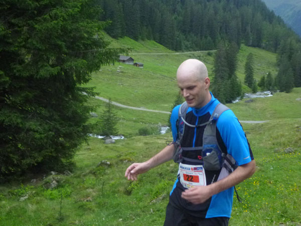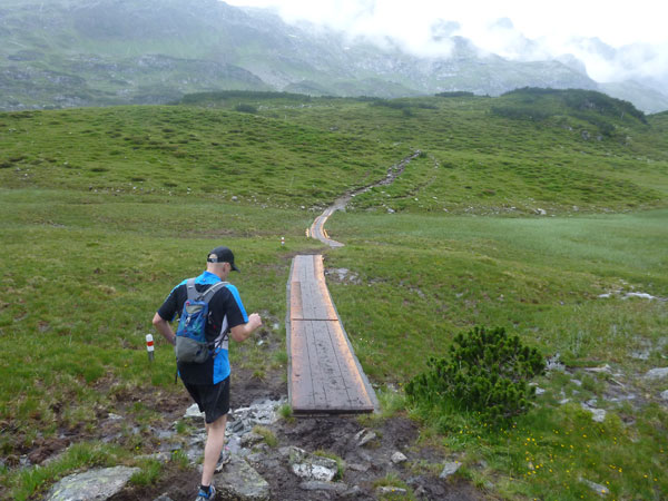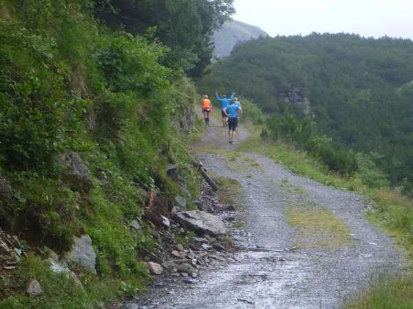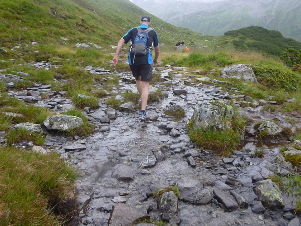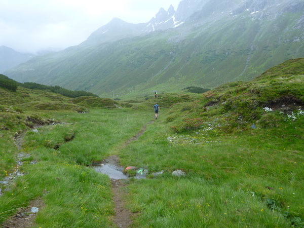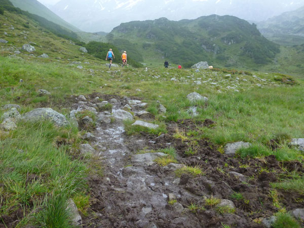 Der Trail wird immer schmieriger und schwieriger, der Spaß bei mir nimmt zu. Die Almwiesen entwickeln sich mit dem zunehmenden Regen zu einer explosiven Mischung aus Kuhscheiße, Schlammlöchern, Wasserläufen und rutschigen Gesteinsbrocken. Ich kann hier einige Läufer überholen und hinter mir lassen. Aber wer da nicht aufpasst, kann mal schnell seinen Schuh in der Suhle verlieren. Ich habe gerade noch mal Schwein, meiner ist fest geschnürt, dafür tauche ich in ein Wasserloch. B´jak hatte da weniger Glück. Bei der Verfolgung von Stephan Hugenschmidt musste er sein wichtigstes Lauf-Utensil erst aus dem Matsch fischen, danach war der Stephan über alle Berge.