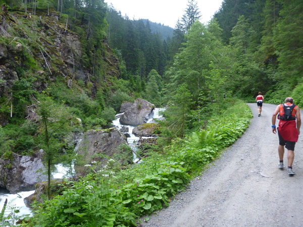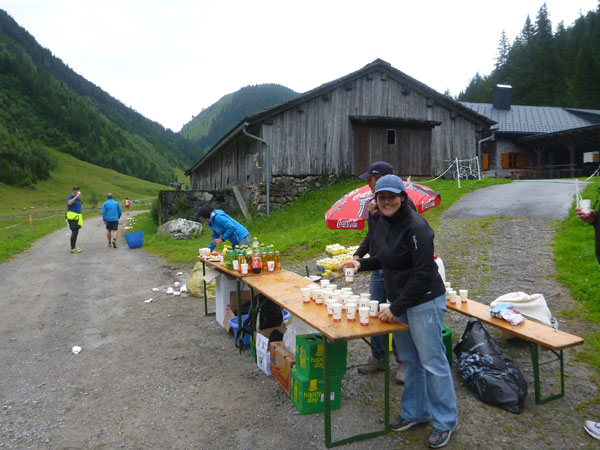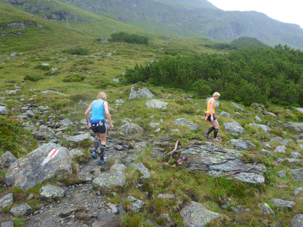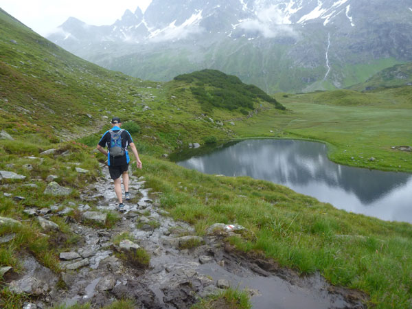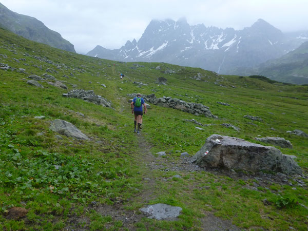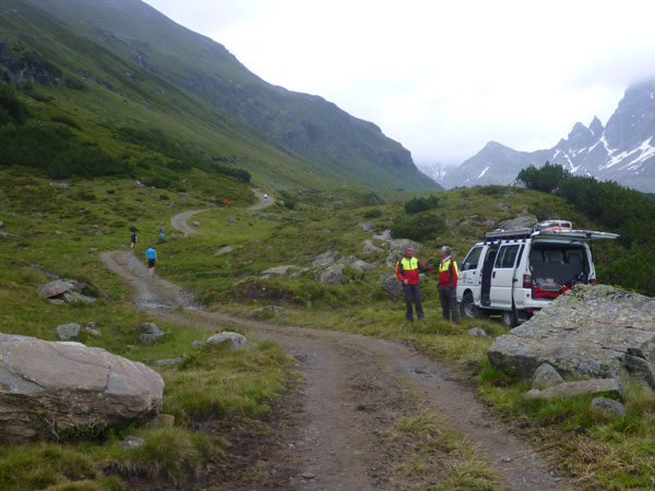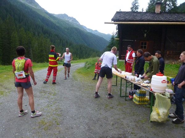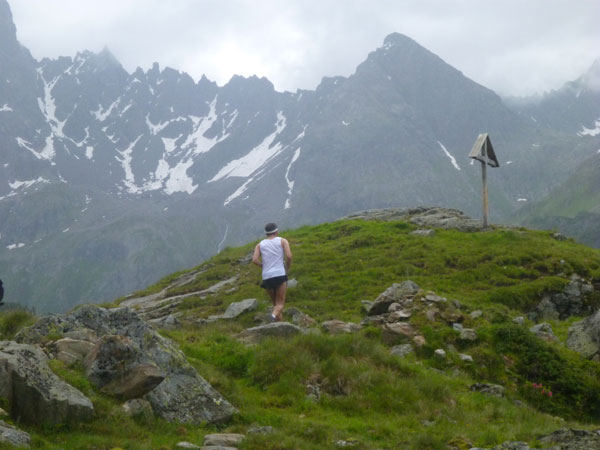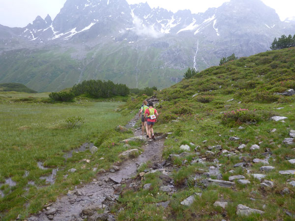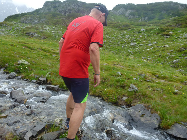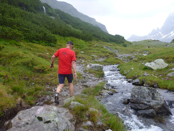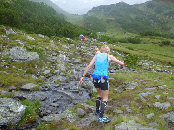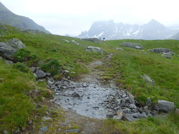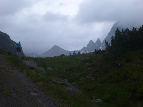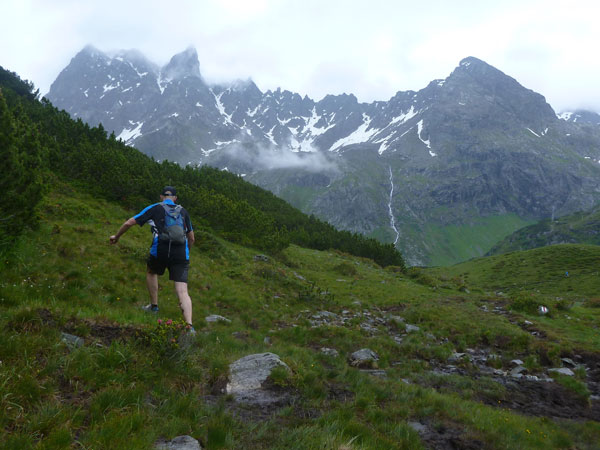 Der Trail wird immer schmieriger und schwieriger, der Spaß bei mir nimmt zu. Die Almwiesen entwickeln sich mit dem zunehmenden Regen zu einer explosiven Mischung aus Kuhscheiße, Schlammlöchern, Wasserläufen und rutschigen Gesteinsbrocken. Ich kann hier einige Läufer überholen und hinter mir lassen. Aber wer da nicht aufpasst, kann mal schnell seinen Schuh in der Suhle verlieren. Ich habe gerade noch mal Schwein, meiner ist fest geschnürt, dafür tauche ich in ein Wasserloch. B´jak hatte da weniger Glück. Bei der Verfolgung von Stephan Hugenschmidt musste er sein wichtigstes Lauf-Utensil erst aus dem Matsch fischen, danach war der Stephan über alle Berge.