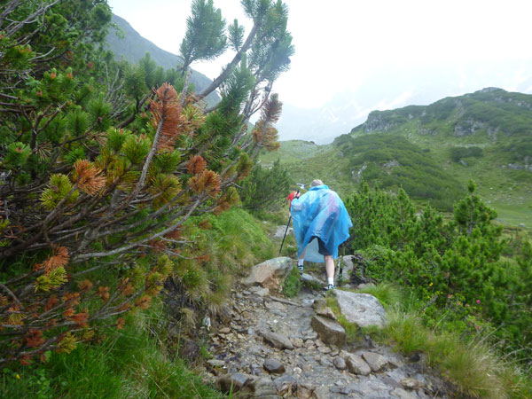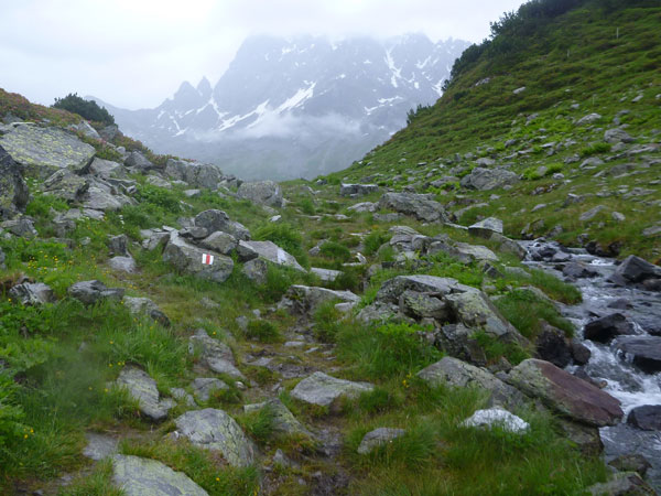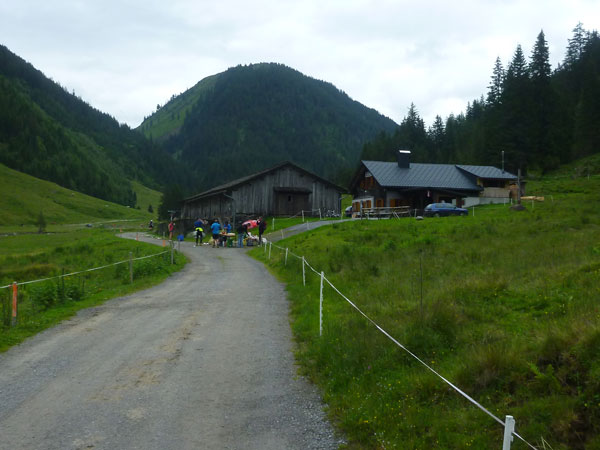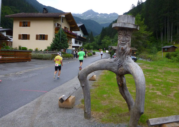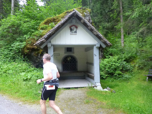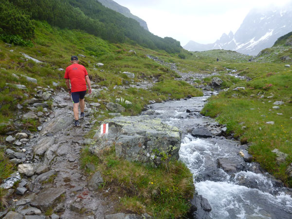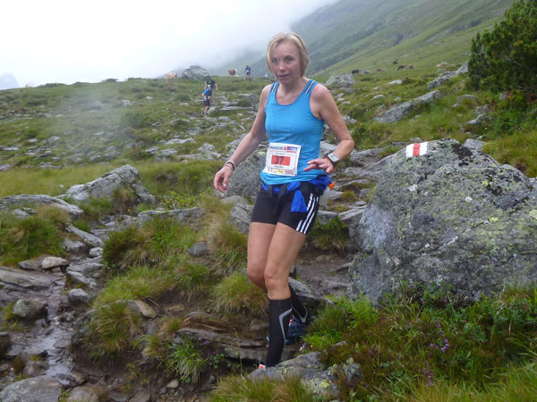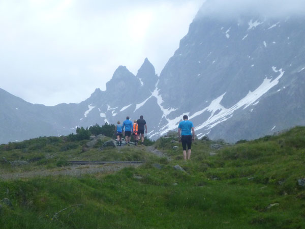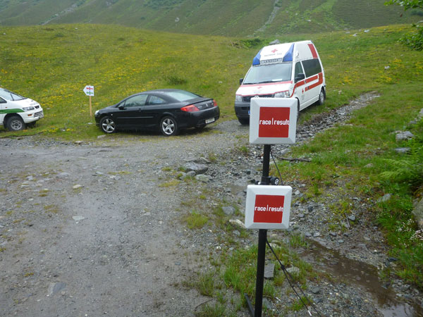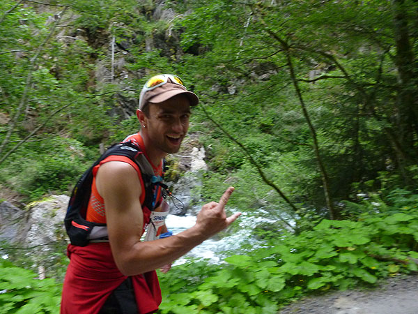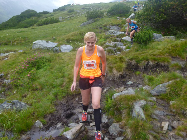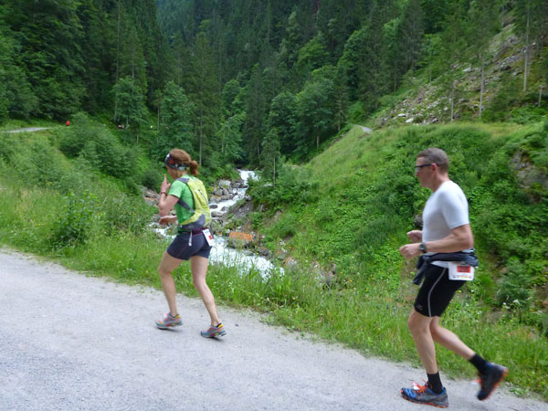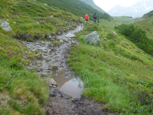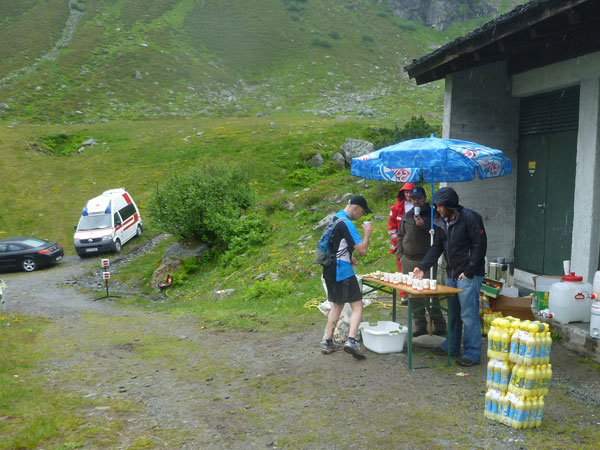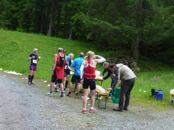 Der Trail wird immer schmieriger und schwieriger, der Spaß bei mir nimmt zu. Die Almwiesen entwickeln sich mit dem zunehmenden Regen zu einer explosiven Mischung aus Kuhscheiße, Schlammlöchern, Wasserläufen und rutschigen Gesteinsbrocken. Ich kann hier einige Läufer überholen und hinter mir lassen. Aber wer da nicht aufpasst, kann mal schnell seinen Schuh in der Suhle verlieren. Ich habe gerade noch mal Schwein, meiner ist fest geschnürt, dafür tauche ich in ein Wasserloch. B´jak hatte da weniger Glück. Bei der Verfolgung von Stephan Hugenschmidt musste er sein wichtigstes Lauf-Utensil erst aus dem Matsch fischen, danach war der Stephan über alle Berge.
