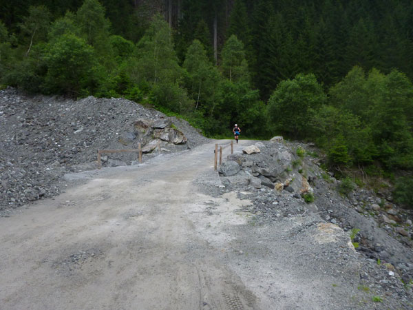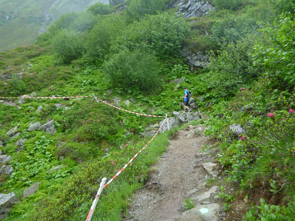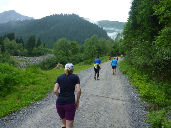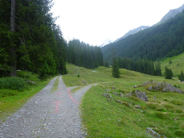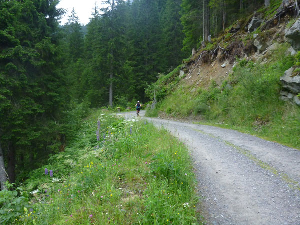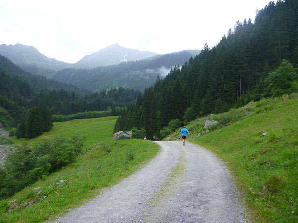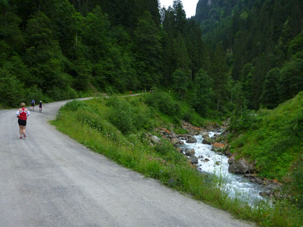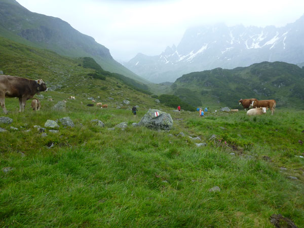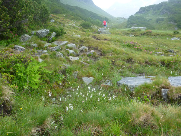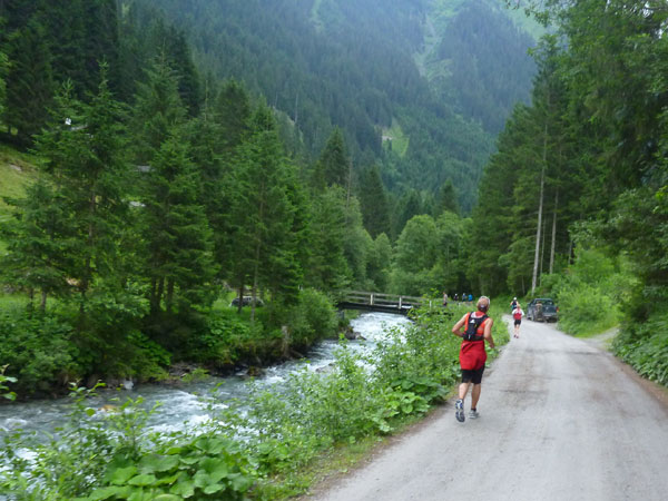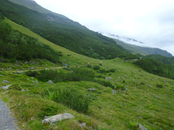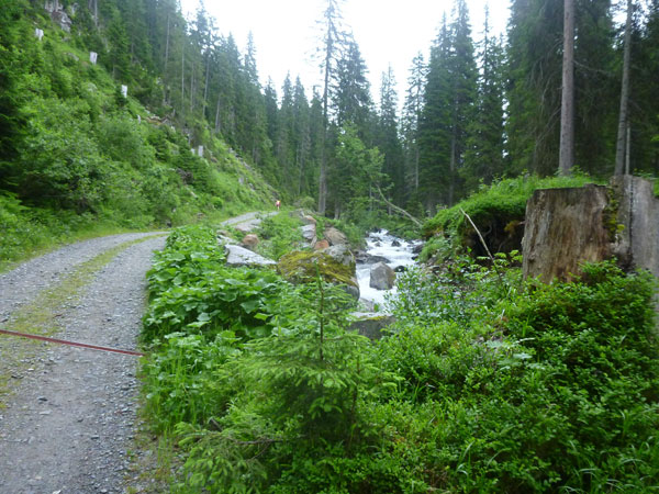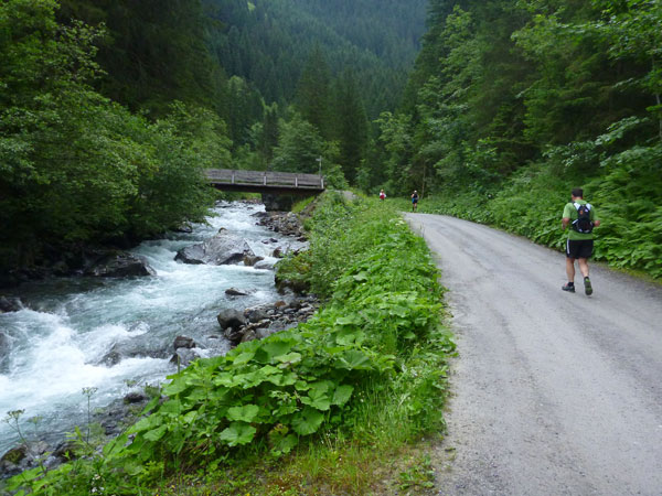 Der Abschnitt im Silbertal ist beendet, wir wechseln die Richtung, es geht mehr nach Norden hinein in das Verwalltal und wir bekommen mit der Rosanna eine neue Begleiterin. Sie fließt ab jetzt fast ständig neben uns hinunter bis nach St. Anton. Wer Zeit gut machen will und gut runter brettern kann, kommt auf den nächsten 5 Kilometern voll auf seine Kosten. Es geht ausschließlich und gut zu laufen bis zu den zotteligen Hochlandrindern bergab. Bei den etwa 250 negativen Höhenmetern sind auch keine sonderlich steilen Abschnitte dabei.