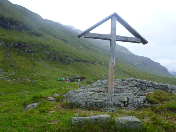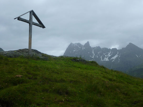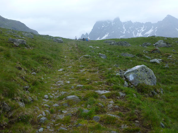 Einfach traumhaft. Na ja, mal abgesehen vom Wetter vielleicht, ist aber noch erträglich. Und wieder eine Labestelle, die Obere Fresch Alpe liegt auf 1890 Meter. Unmittelbar danach sind wir an unserem höchsten Punkt und es beginnt der geile Sommertrail über das Winterjöchle, der heute für uns so ziemlich alles bereit hält, was einen echten Trailrunner mit der Zunge schnalzen lässt, obwohl die Bedingungen momentan nicht mehr viel mit Sommer zu tun haben. Macht die Sache aber auch reizvoll. Der Übergang wurde bereits Ende des 18. Jahrhunderts als Verbindung zwischen Tirol und Vorarlberg genutzt. Was die hier rüber gekarrt haben, weiß ich nicht, aber es war bestimmt eine wesentlich härtere Nummer, als das was uns bevorsteht.