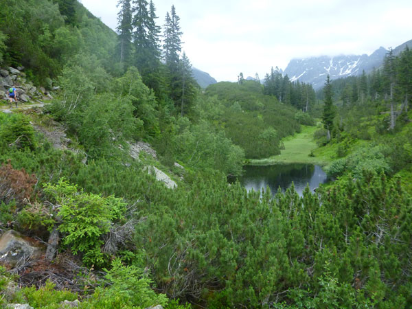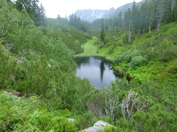 Die Aussicht nach unten – wir sind jetzt über der Baumgrenze und haben freie Sicht, unter uns liegt der liebliche, kreisrunde Pfannsee.