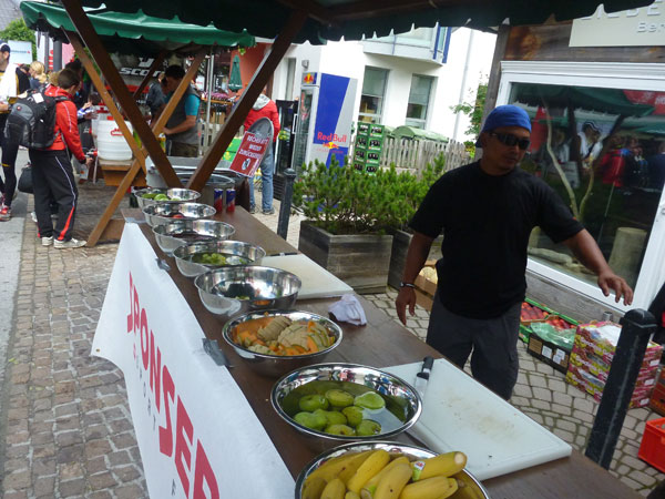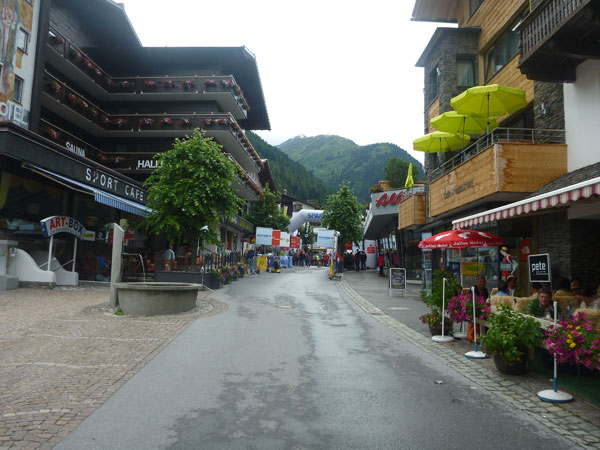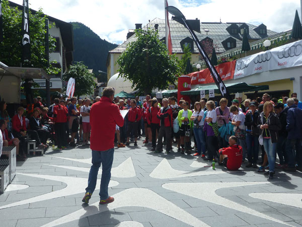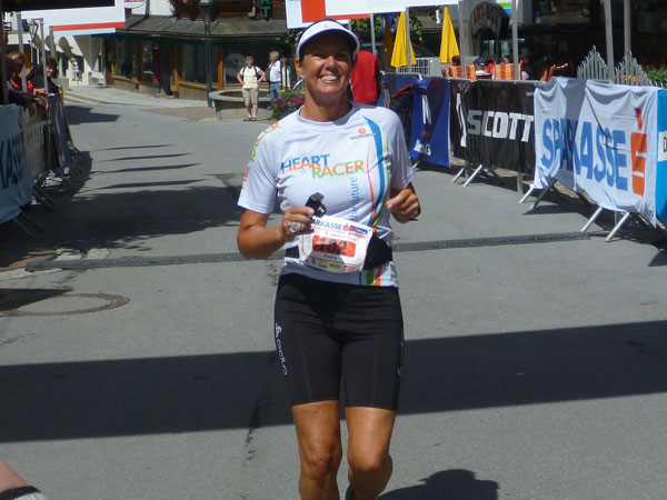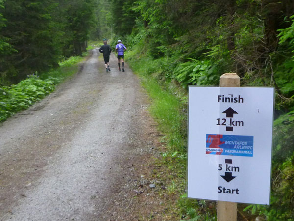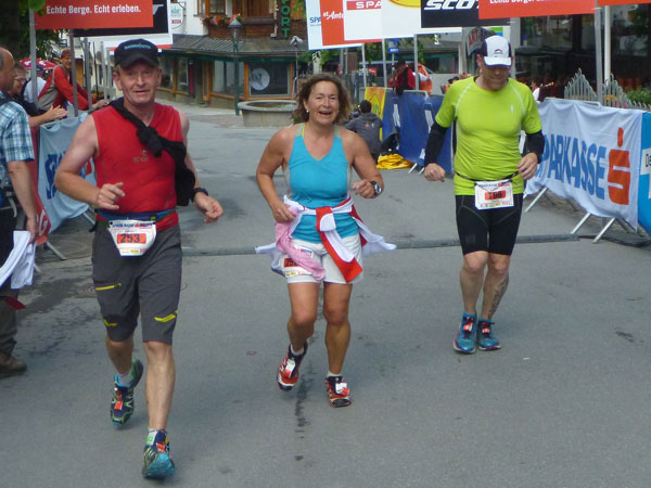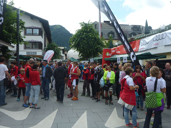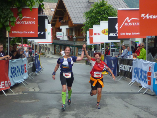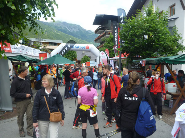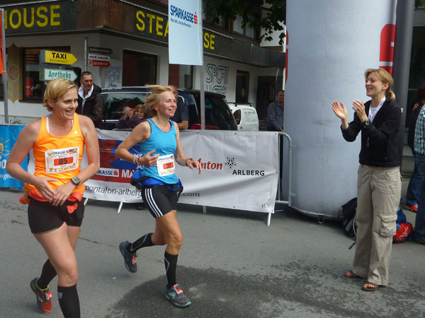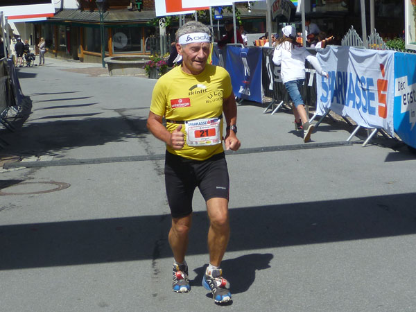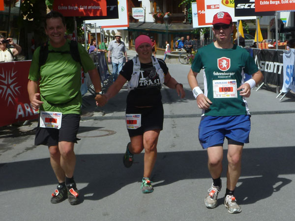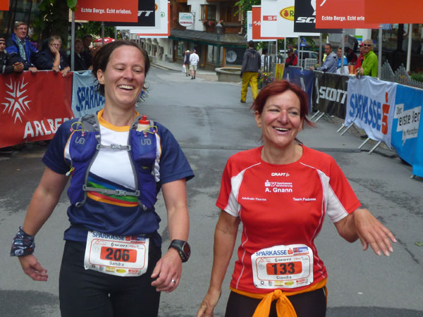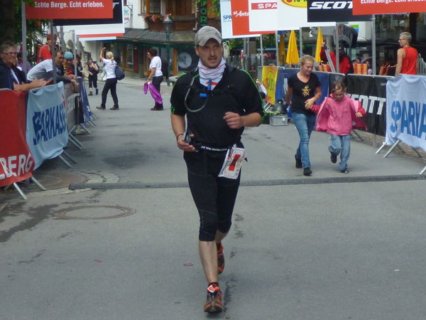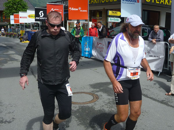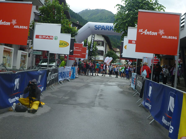 Der letzte Kilometer führt durch die Dorfstraße von St. Anton. Zwischen den Gebäuden kann man rechts oben das Karl Schranz Zielstadion der alpinen Ski-WM 2001 ausmachen. Mit mehr als 350.000 Zuschauern war sie seinerzeit ein riesen Erfolg. Ein paar davon würden unserem Zieleinlauf auch nicht schaden, aber erst unmittelbar im Zielbereich wird bei jedem Finisher von einer stattlichen Anzahl gejubelt. Ja und die Sonne kämpft sich jetzt auch langsam durch die Wolken.