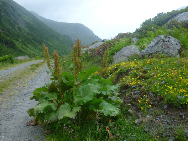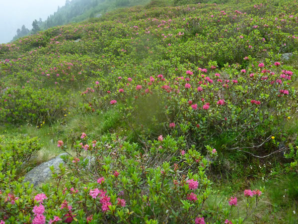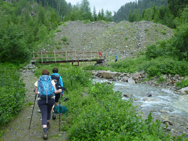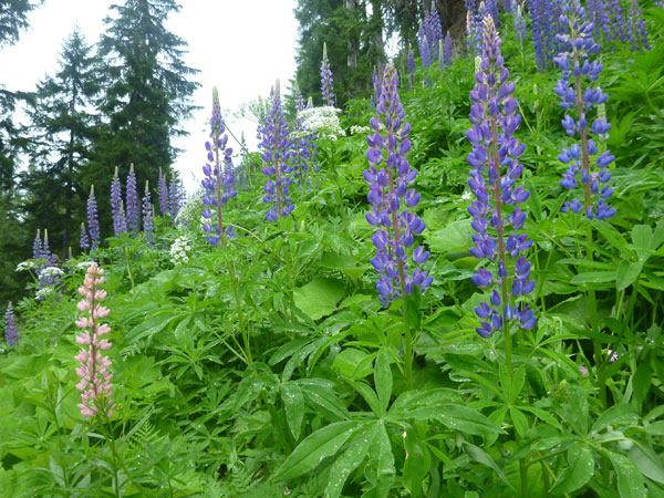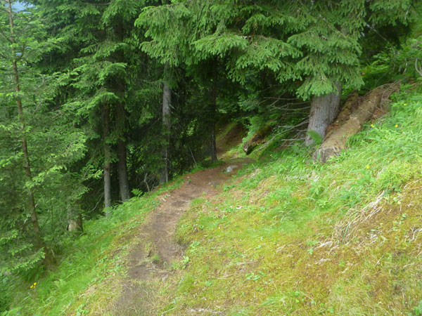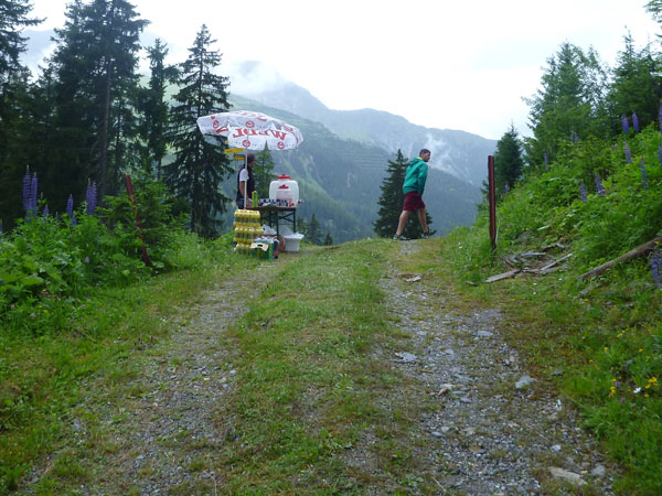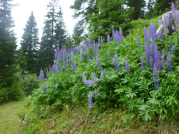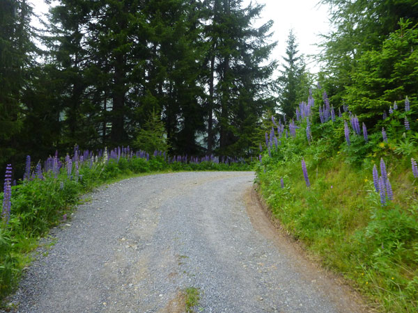 Mit mehreren deftigen Steigungen beginnt ab hier die neue Streckenführung des MAM. Ein Waldweg führt uns auf ein kurzes Intermezzo in das Moostal. Eine einfache Holzbrücke leitet uns über den Moosbach auf einem wilden Trail wieder zurück Richtung St. Anton. Links und rechts stehen ganze Felder von violetten Wildlupinen Spalier.