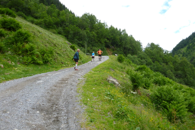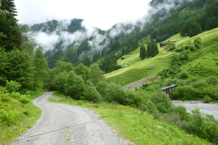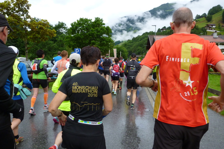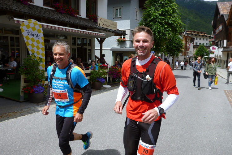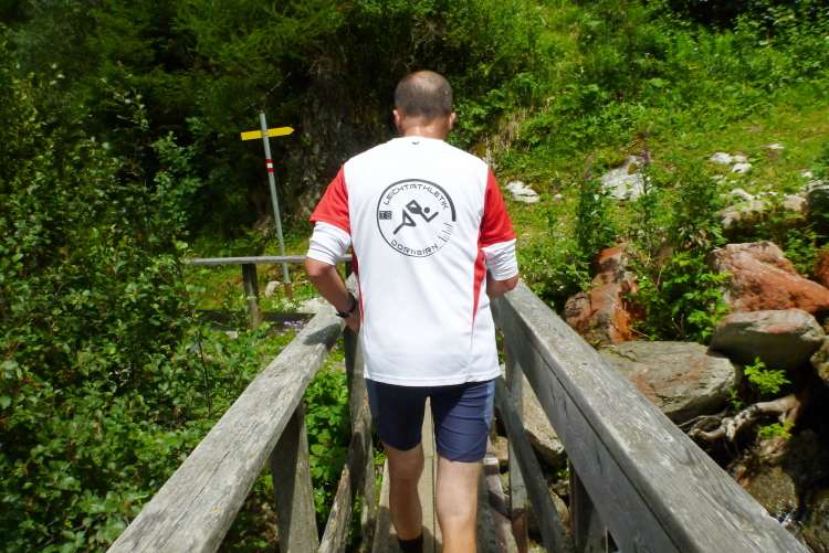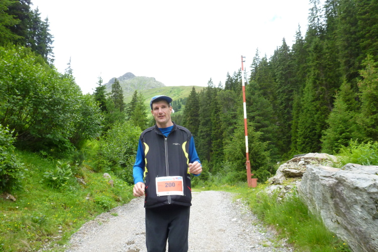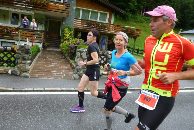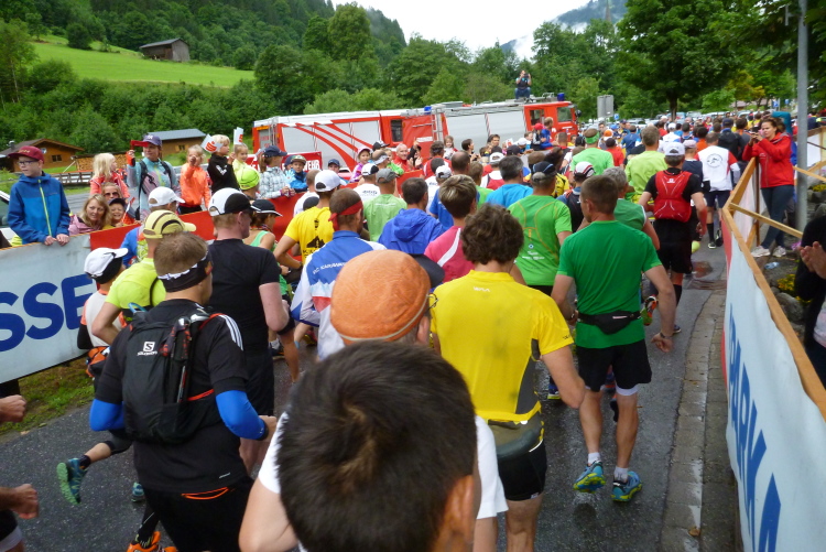 Pünktlich werden wir mit einem Schuss auf die Strecke losgelassen. Hier ist es anders als bei einem üblichen Bergmarathon, du läufst erst einmal talauswärts. Zwischen Feuerwehrhaus und Ortsmitte haben sich viele Einwohner, Touristen und Laufangehörige versammelt, sie klatschen mit Begeisterung. Viele Kinder sind darunter, die auf ihre Starts (ab 09.00 Uhr) warten. Wir verlassen den Ort und laufen noch ein Stückchen weiter auf der Hauptstraße. Nach rund zwei Kilometer biegen wir links ab, wir überqueren die Litz. Auf der linken Flussseite geht es bergan und taleinwärts. Rund 18 Kilometer wird unser Weg ansteigen, von 840 Meter bis rund 1950 Meter im Bereich des Langen Sees. Aber keine Angst, steilere Rampen wechseln sich mit geraden oder sanft steigenden Wegstücken ab. Was nicht gelaufen werden kann oder mag, der marschiert halt ein Stück. Da kann es jeder halten, wie er mag.