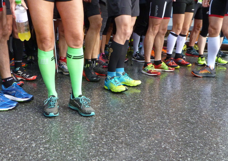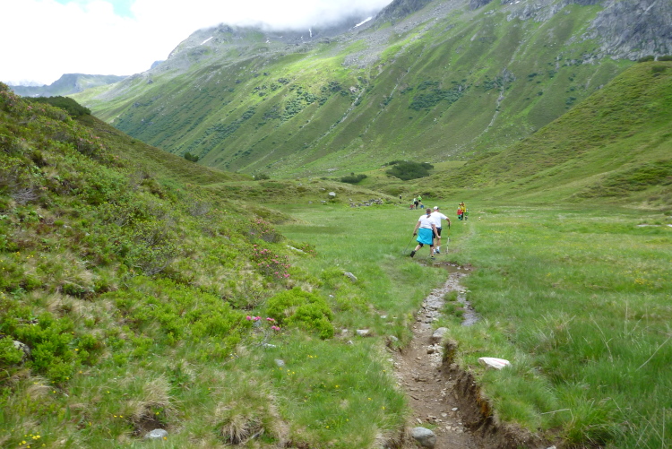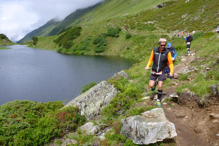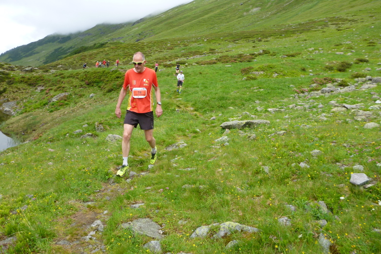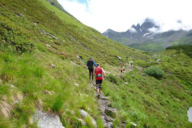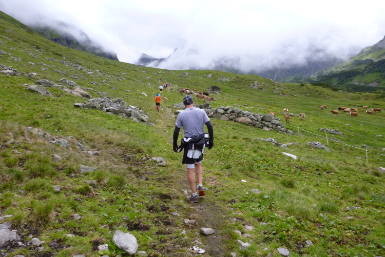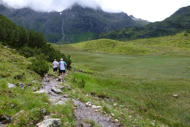 Heute ist die Sicht gut, auch wenn die umliegenden hohen 3000er sich weiterhin in den Wolken verstecken. Nicht nur mein Tempo ist drastisch gesunken. Kaum schneller als ein flotter Bergwanderer sind wir unterwegs. Nur wenige Stücke können wir belaufen, dann folgen wieder Steine und morastige Stellen. Aber diese sind leicht zu umgehen. Doch ich sehe auch Läufer, die hier schon in die tiefen, morastigen Stellen ungewollt hineinsteigen und nicht die Trittsicherheit haben, die man benötigt. Doch hier können wir das lernen. Auch wenn beim Lernprozess mal ein Schritt danebengeht und der Dreck spritzt. Außerdem tut das nicht weh, nur die Schuhe brauchen dann halt eine Grundreinigung.