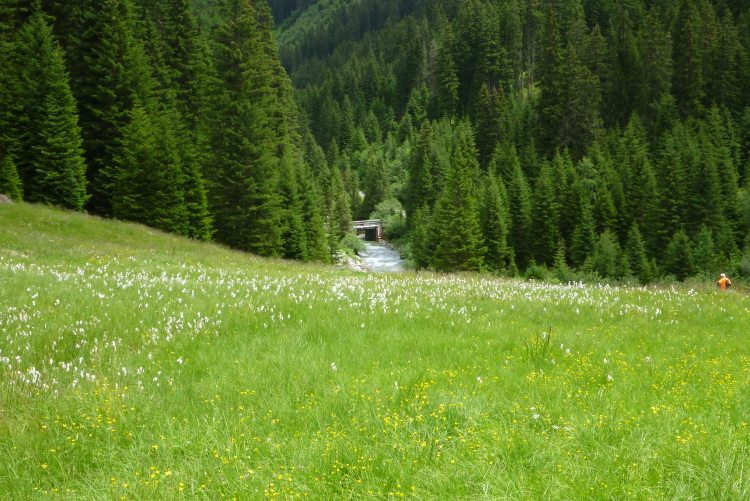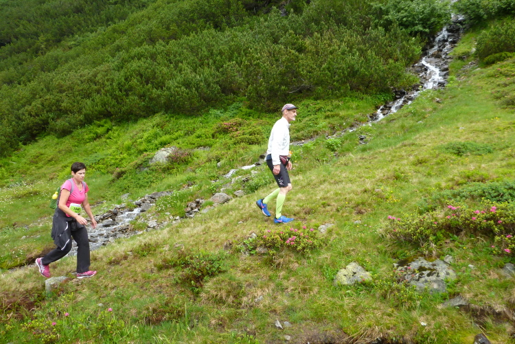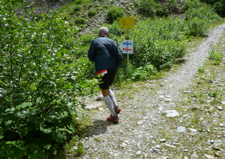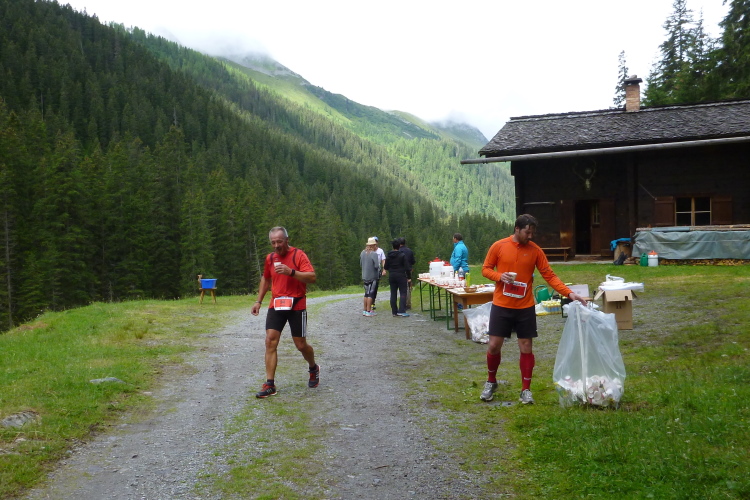 Die V-Stelle bietet wieder alles, was das Herz begehrt. Nun sogar gekochte Kartoffeln mit Salz. Wer jetzt noch Kraft hat, kann es kilometerweit das Tal hinunterrollen lassen. Es isz schon eine Weile her, dass ich hier im Kilometerschnitt von 4.30 Minuten hinuntergebrettert bin. Die schnellen Läufer werden es heute ähnlich halten. Schnell erreichen wir die Fraschhütte (1822 Meter) und die nicht einsehbare Konstanzer Hütte (1688 Meter).