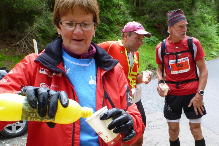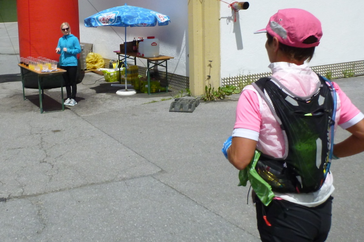 Beim 16. Kilometer (knapp zwei Stunden bin ich nun unterwegs) haben wir schon 700 Höhenmeter hinter uns gebracht. Die Tankstellen sind seit geraumer Zeit noch im engeren Abstand, ich schätze alle vier Kilometer. Neben Wasser finden wir nun Fruchtsaftschorlen mit verschiedenen Sortierungen sowie Waffeln, Müsliriegeln, Äpfel, Bananen und Gel. Die Auswahl ist groß.