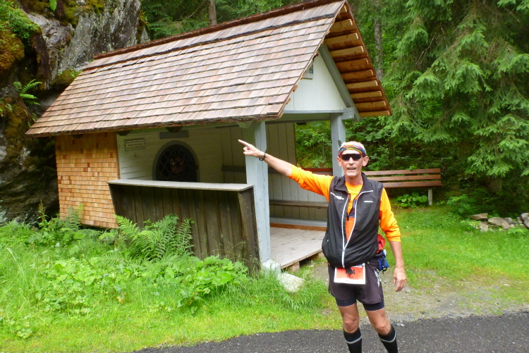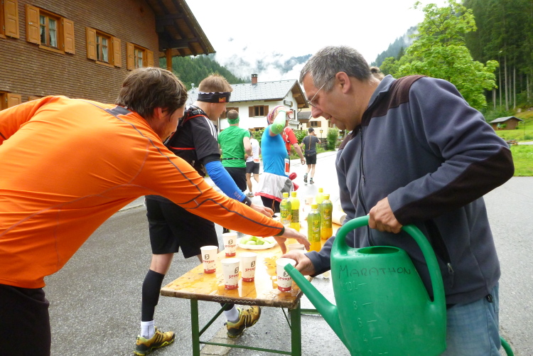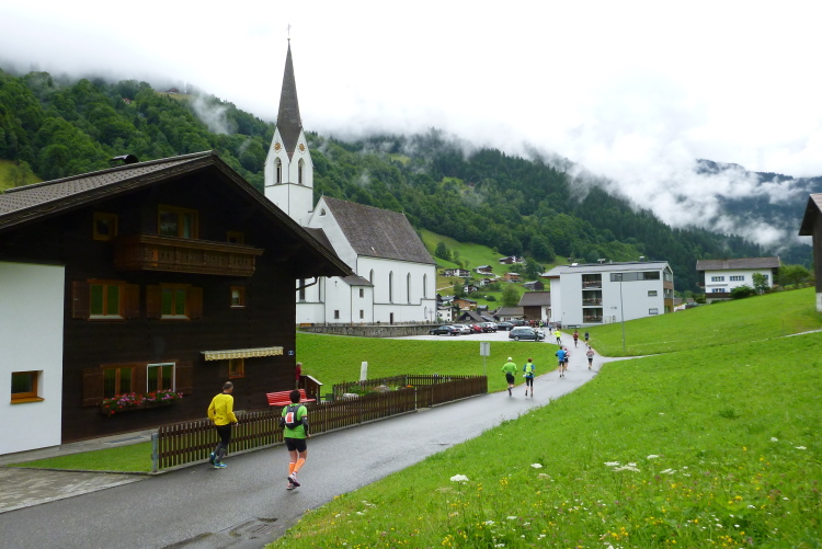 Ein paar Meter weiter sehe ich links die Kristbergbahn, die auf das kleine Wintersportgebiet Kristberg hochführt. Im Sommer steht die Seilbahn für die Wanderer zur Verfügung. Dort ober kann man der aus dem 15. Jahrhundert stammenden Kirche St. Agatha einen Besuch abstatten. Die Hl. Agatha von Catania ist Schutzpatronin der Feinschmiede und Glockengießer. Dann geht es zum zweiten Mal durch den Startbereich, viele Kinder wollen abgeklatscht werden und bilden einen Trichter, so dass der Läufer sich dem Procedere nicht entziehen kann. Gleich dahinter finden wir die erste Tankstelle. Trinkwasser (aus einer grünen Gießkanne!) und Iso werden ausgegeben. Die Aufwärmrunde endet.