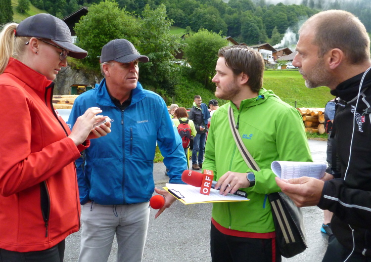 Seit der Oberen Freschalpe sehe ich viele Helfer der Bergwacht stehen, die unseren Lauf überwachen, jederzeit bereit einzugreifen und zu unterstützen. Als ich einen Akja mit Rad näher betrachte, meint der Helfer nur: „Den brauchst du nicht, ein Transport darauf ist alles andere als gemütlich“. Kurz nach 11.30 Uhr erreiche ich die Landesgrenze von Vorarlberg zu Tirol, drei Stunden bin ich unterwegs, rund 22 Kilometer gelaufen. Und dann haben wir nach einem kurzen Abschwung wieder festen Boden unter den Füßen, wo an der Rosanna Bachfassung wieder eine V-Stelle auf uns wartet. Gut drei Kilometer lang ging es trailartig über das Silbertaler Winterjöchli, nicht zu lange für Trailneulinge.