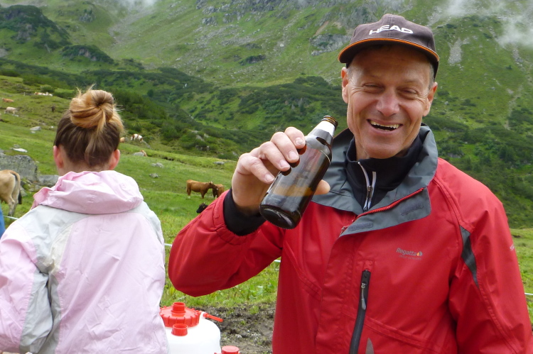 An der Oberen Freschalpe (1890 Meter) endet der Fahrweg, zwanzig Kilometer haben wir geschafft. Viele Höhenmeter sind nicht mehr zu belaufen, vielleicht noch 50 bis 100 in Summe bis zur Landesgrenze Tirols. Auf meine Frage an der V-Stelle nach einer Hopfenschorle höre ich einen Helfer murmeln, ob ich denn eine wolle, es hätte schon etwas da. Da höre ich mich nicht nein sagen. Ich könne gleich die ganze Halbe konsumieren. Nun, so gierig bin ich auch wieder nicht und teile das Bier mit einem Käskaspar, so sein Spitzname, den der Durstige mir nennt. Ja, und der Reporter ist halt neugierig und der Blick auf die Ergebnisliste hilft. Der Caspar Greber (Vereinsname Käsecaspar) ist es. Zum Wohlsein.