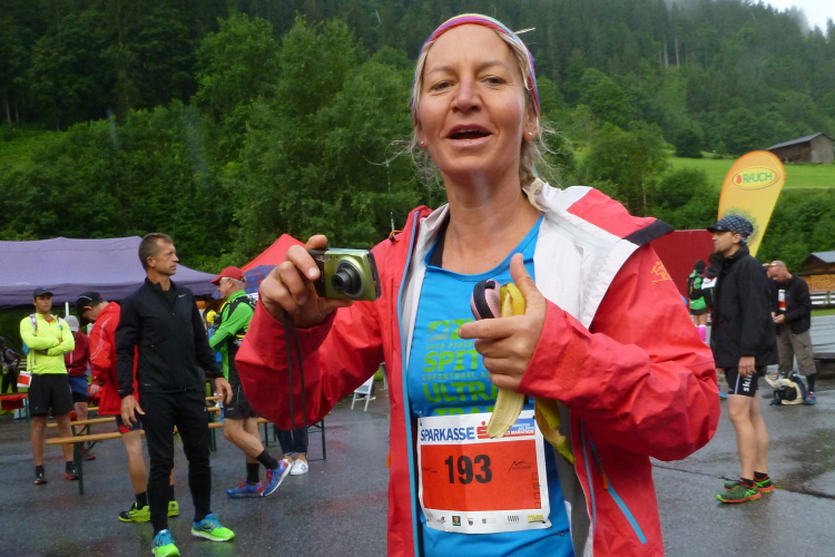 Ein paar Minuten später an einer Brücke über die Rosanna kommt die letzte Streckentrennung. Der Kurs T33 biegt links ab, wir halten uns geradeaus. An der V-Stelle gibt es nun als Spezialität ein Obstbufett aus Bananen, Äpfeln und Aprikosen. Neben dem üblichen anderen Speisen. Vorbei am Arlberges Klettergarten kommt der 33. Kilometer. Zunehmend setzt sich nun die Sonne durch. Ich könnte die Jacke ausziehen, bin aber zu faul.