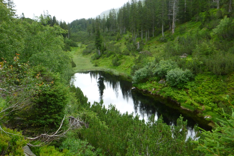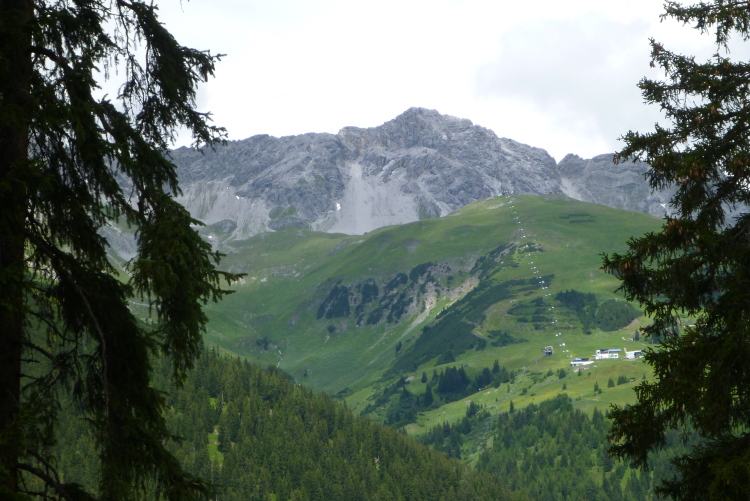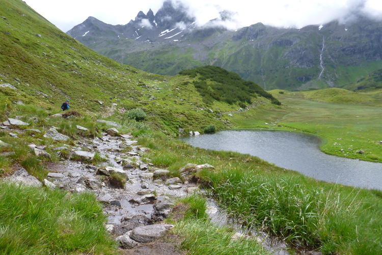 Das Litztal wird nun enger und offener, der Baumbewuchs nimmt ab. Der Fahrweg wird zunehmend ruppiger und wieder steiler. Nur kurz kann ich den Patteriol sehen, einer der höchsten Spitzen im Verwall. Er lacht in einer Wolkenlücke auf uns herunter. Nur gut ausgebildete Bergsteiger können der Patteriol besteigen. Zu meiner Überraschung sehe ich dann den Schwarzsee, hier war der Filmdrehort zu Joseph Vilsmaiers „Schlafes Bruder“.