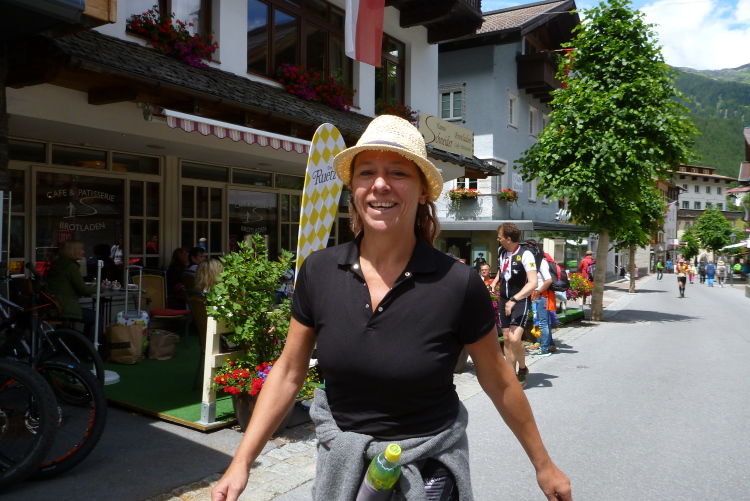 Das Gefälle nimmt nun weiter ab und endet am Verwallsee, wo die Rosanna für eine Stromgewinnung aufgestaut wird. Bernadette ist nun immer auf meiner Höhe. Mal ist sie vorne, sie kann gut hinunterbrettern, mal laufe ich an ihr vorbei, wenn es ansteigt. An einer Marienfigur will sie mich knipsen. Nur kurz dauert die Fotorast, dann rennen wir gemeinsam weiter.