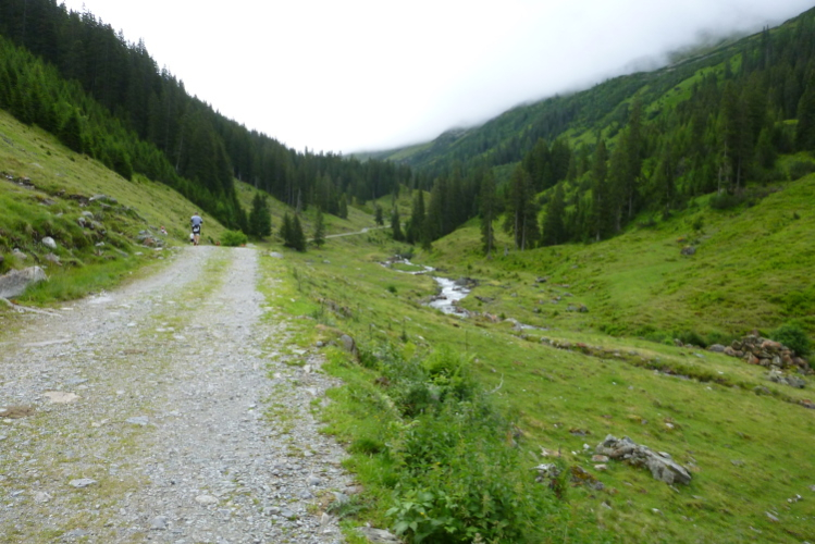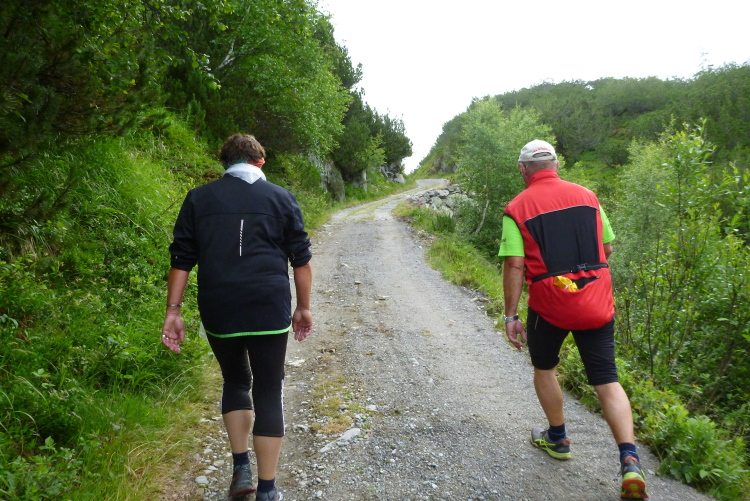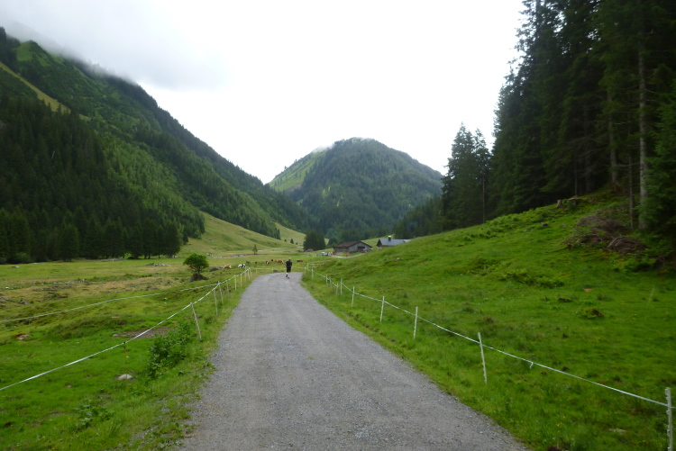 Zu Beginn haben wir noch guten Asphalt als Laufuntergrund. Bernadette Obermeier vom Team Bittel und Thomas Simon (TG Groß Kariben) laufen auf meiner Höhe. Ich bleibe öfters stehen und muss mich immer wieder heranarbeiten. Der gute Asphalt endet, der Untergrund wir nun ein wenig welliger, schließlich wird die Forststraße für den allgemeinen Verkehr gesperrt. Wir werden jetzt nur noch Wanderer, Biker und Personal auf den Almen und Hütten sehen.