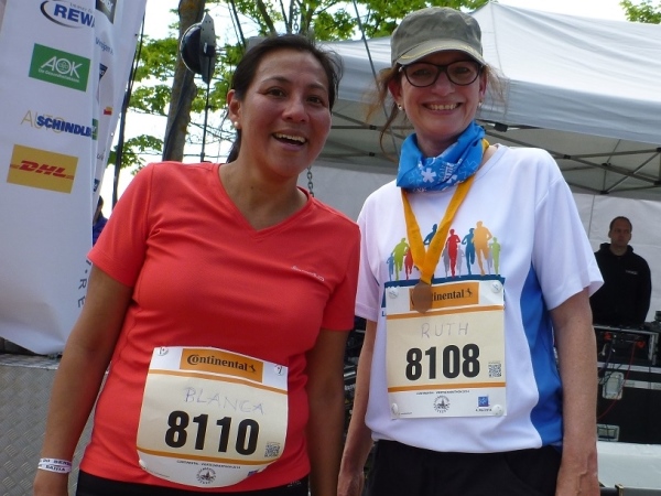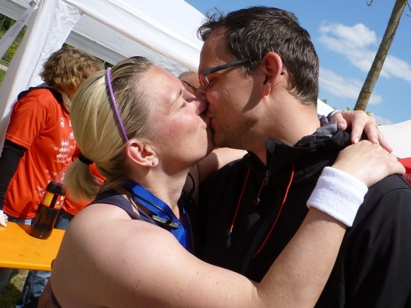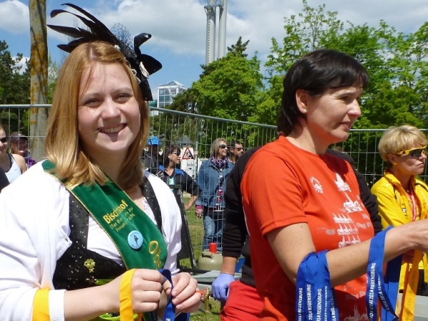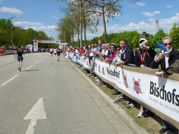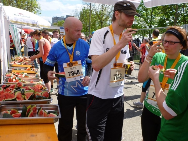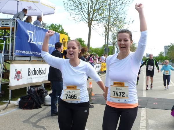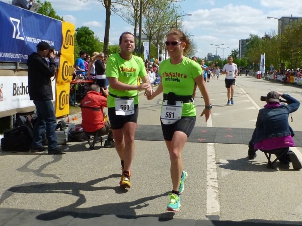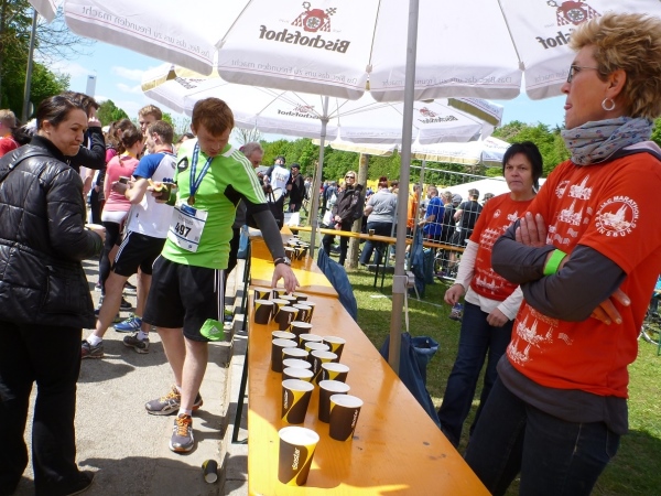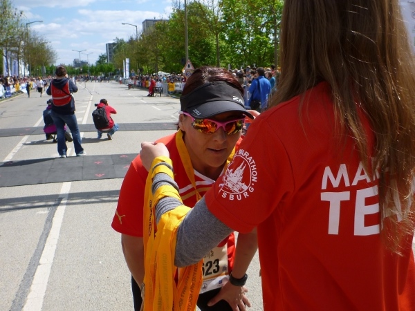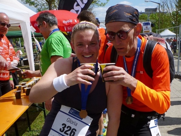 Kurz hinter der Ziellinie erhalten wir Cola, Wasser, Iso, Obst und endlich wieder alkfreies Bischofshof Bier. Lange hätte ich nicht mehr warten dürfen. Kurz vor meinem Duschgang im Westbad werfe ich noch einen Blick auf den Zielkanal und dann kommt noch eine Vereinskollegin und gelernte Journalistin daher, die Gloria Brems. Sie finisht ihren ersten Marathon, lässt sich vom Freund abbusseln und von ihren Arbeitskolleginnen feiern. Die schaffen es sogar, auf die Schnelle noch ein Glas Sekt zu organisieren.
