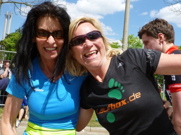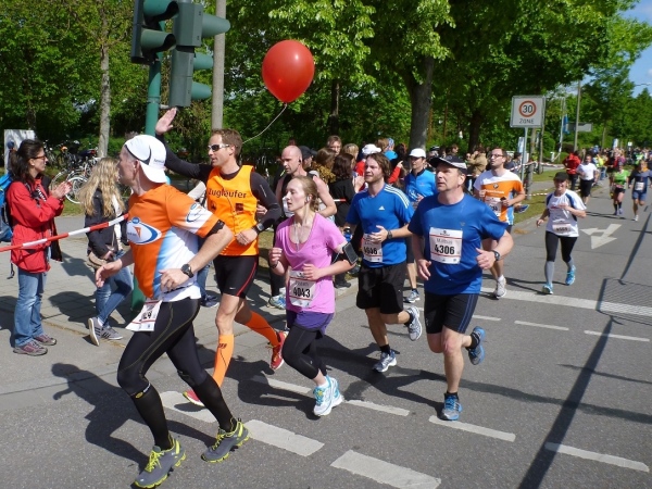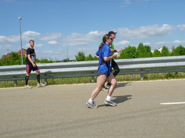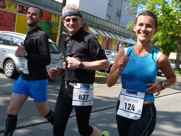 Für einige Bilder bleibe ich wieder stehen und wenn ich Mitläufer fotografiere, sehen ich nur freudige Gesichter. Auf der Conti-Teststrecke habe ich den Vorsprung des 3.45-Pacers deutlich verringert. Als ich auf den Kurs einschwenke, befindet sich der Zeitläufer auf der anderen Seite und hat somit rund 600 Meter Vorsprung.