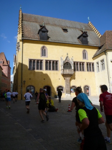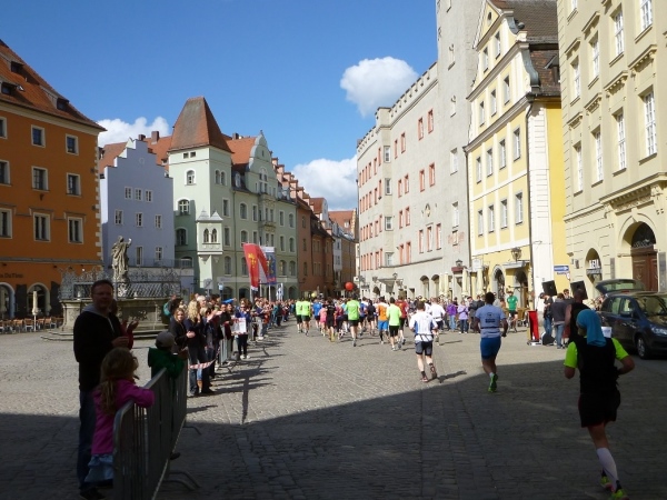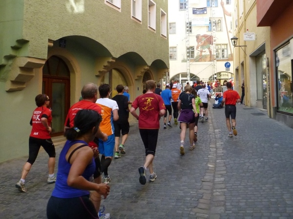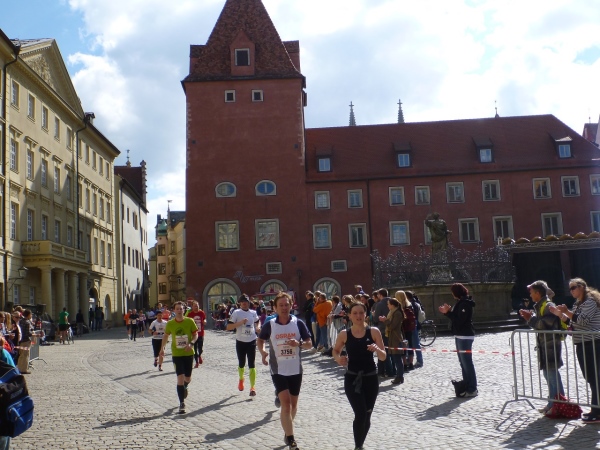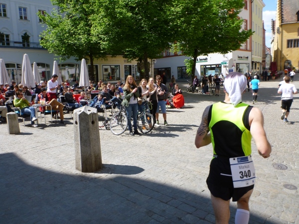 Am Haidplatz haben sich viele Zuschauer in den Cafes versammelt und schauen den Läufern zu und lassen sich von der dargebotene Musik unterhalten. Der Platz liegt zentral in der Altstadt, hat eine dreieckige Form (die Straße aus Osten hat sich hier gegabelt) und wird heute gerne für Open-Air-Verstaltungen verwendet. Ich drehe mich kurz um und sehe in der Mitte den Justitia-Brunnen aus dem 17. Jahrhundert.