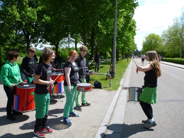 Das Verhältnis vom Halbmarathon zum Marathon ist wie andernorts auch hier deutlich, etwa vier zu eins. Zu meiner Überraschung jedoch ist die Stimmung im Feld und auch am Rand der Strecke weiterhin fröhlich. Auch die Musiker legen sich nicht auf die faule Haut, sondern sind weiter emsig beim Spielen.