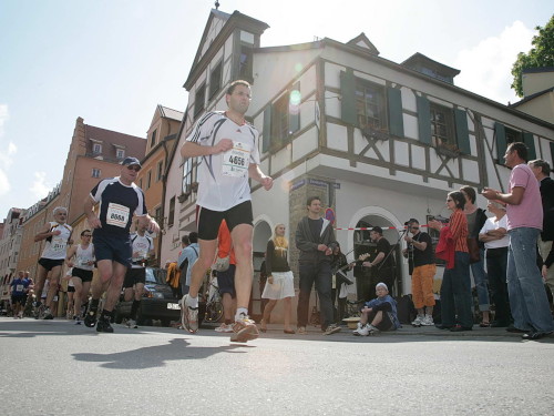 Zunächst geht es durch die Randbezirke, nur vereinzelt wagen sich zu so früher Stunde Zuschauer an die Strecke. Aber der Veranstalter hat vorgesorgt, und das ist wirklich gut so: 17 Bands mit insgesamt 150 Musikern heizen unterwegs ein, wie die Sarchinger Blaskapelle oder die "Wickies". Da kann man auch so manch zuschauerfreien Abschnitt wie beispielsweise im Industriegebiet oder unter einer Autobahnbrücke übertönen. Nach dem kurzen Vorspiel am Rande Regensburgs taucht man erstmals in die Altstadt ein, zwar nur relativ kurz, aber immerhin.