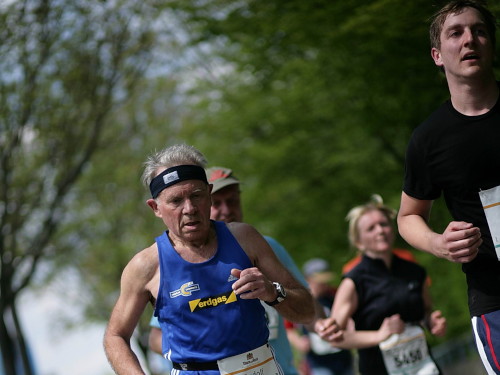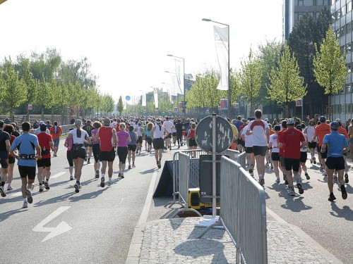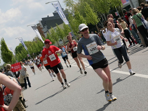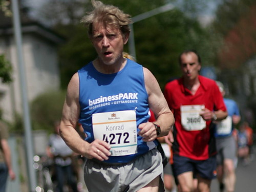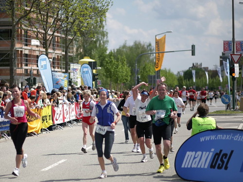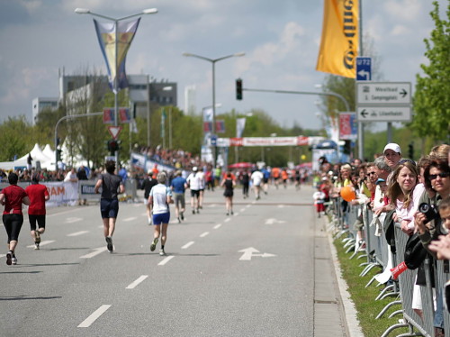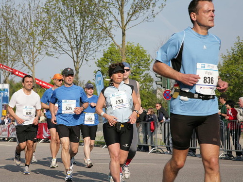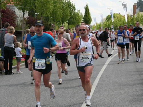 Es folgt eine für meine Begriffe recht eintönige Wendepunktstrecke. Eigentlich nicht so meine Sache, aber angesichts des Wetters ist mir das alles egal. Wie immer suche ich auch jetzt das Positive, genieße den Sonnenschein, die Natur, oder unterhalte mich mit einigen Läufern. Oder sporne an, wie Christian bei seinem ersten Marathon. Monatelang hat sich Christian auf diesen, seinen großen Tag vorbereitet, nun soll es klappen, auch wenn ihn ein paar Selbstzweifel plagen. "Du packst das schon", sind meine Worte, obwohl ich Christian überhaupt nicht kenne. Und tatsächlich wird er am Ende, wenngleich entkräftet, gut ankommen.