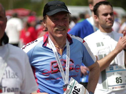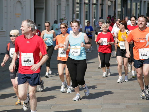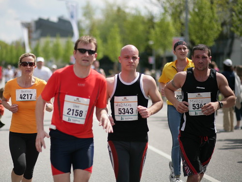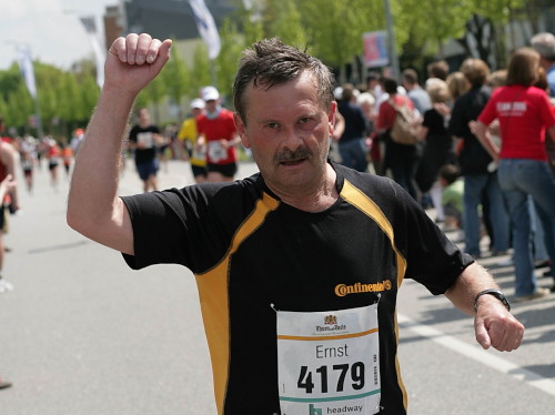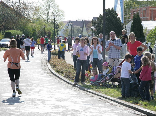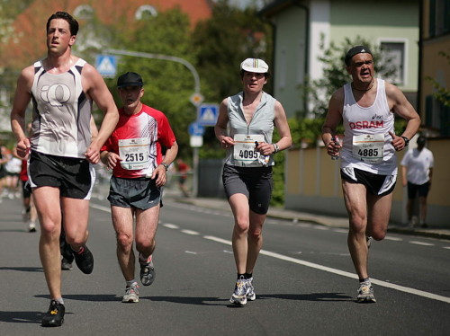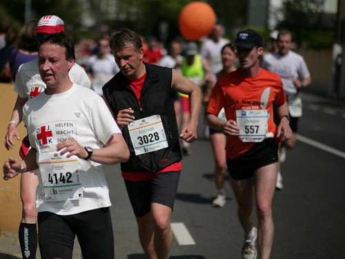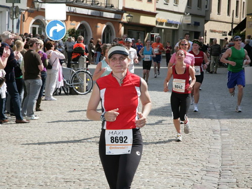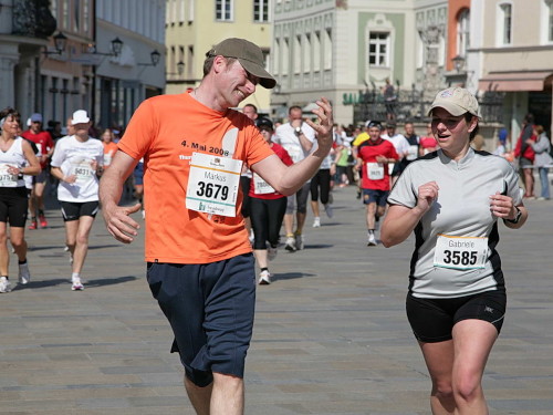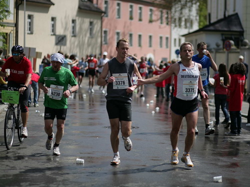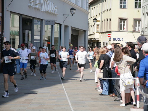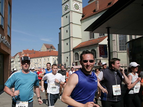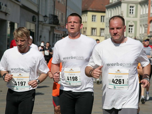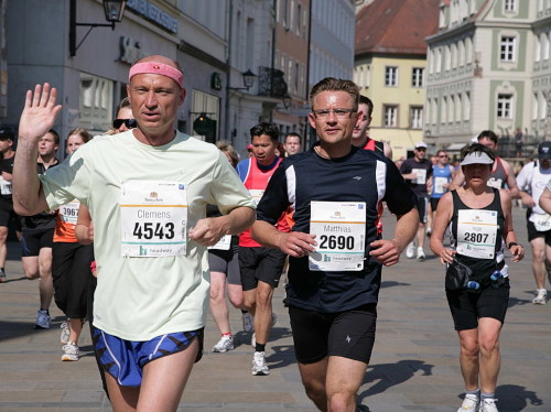 Viel zu schnell ist alles wieder vorbei, das enge Gassenwirrwarr der Altstadt weicht der modernen und eher tristen Regensburger Peripherie. Irgendwie schade, finde ich, denn Regensburg hat nicht viel weniger Reize zu bieten wie z.B. Florenz. Und dort gab´s mehr Historie für die Läufer. Doch die Enttäuschung ist nur von kurzer Dauer, das Zielbanner ist zum Fühlen nahe. Vor mir Bremsläufer Ernst mit dem 3:59er-Ballon, der seine Gruppe sicher nach Hause bringt. St. Wendel geht mir durch den Kopf, wo ich selbst mit einem Ballon unterwegs war.