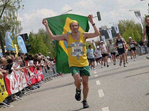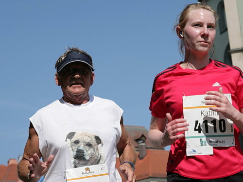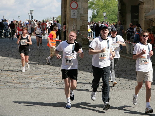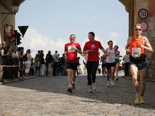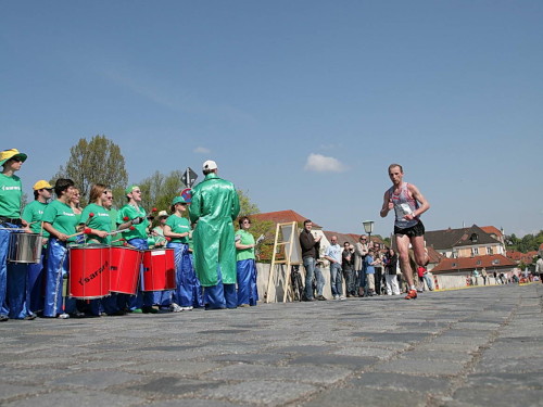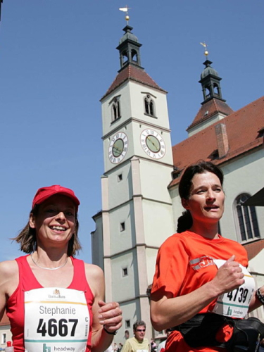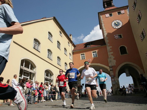 Doch zurück auf die Strecke: in der Ferne ist bereits der Dom zu erkennen, den ich so gerne paar mal umrundet hätte. Und er rückt immer näher, bald ist er zum Greifen nahe. Wir durchqueren ein Stadttor, die Altstadt ist erreicht, Zuschauer und Touristen werden immer mehr. Endlich ist auch die Donau in Sicht, der Fluss wird überquert, einige Gassen durchlaufen, dann kommt der eigentliche, der ultimative Höhepunkt: die Steinerne Brücke. Die Trommlergruppe "Sarará" begleitet die Läufer auf ihrem Weg über die älteste noch erhaltene Donaubrücke. Vor einem liegt das alte Regensburg, ab und zu huschen japanische Touris durchs Bild, fotografieren Teilnehmer, vor allem aber den mächtigen Dom St. Peter.