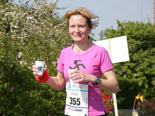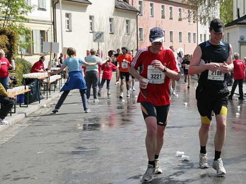 In Illkofen, am östlichen Wendepunkt, dann noch mal Musik von "Drum It", und auf geht´s wieder zurück nach Regensburg. Es wird wärmer, die Schwammstationen sind nun mehr als gefragt, so eine feuchte Abkühlung gibt direkt neuen Schub. Mir fällt bei dem Sommerwetter ein, dass es durchaus sinnvoll wäre - ich meine damit nicht nur die Regensburger Veranstalter - neben Flüssigkeiten auch Sonnencreme anzubieten. Die Sportler sind permanent der Sonne ausgesetzt, da wäre ein Schutz (wenn nicht schon beim Start aufgetragen) sicherlich angebracht. Nur so ein Vorschlag auch für andere Marathons im Sommer...