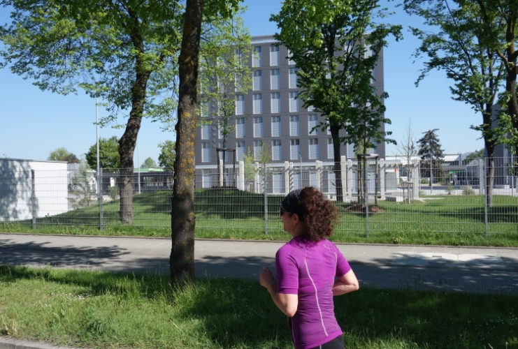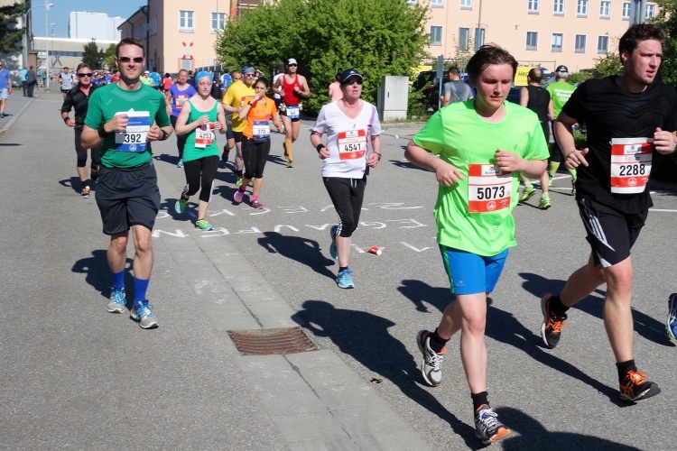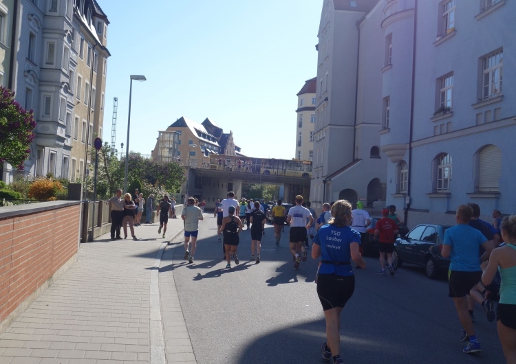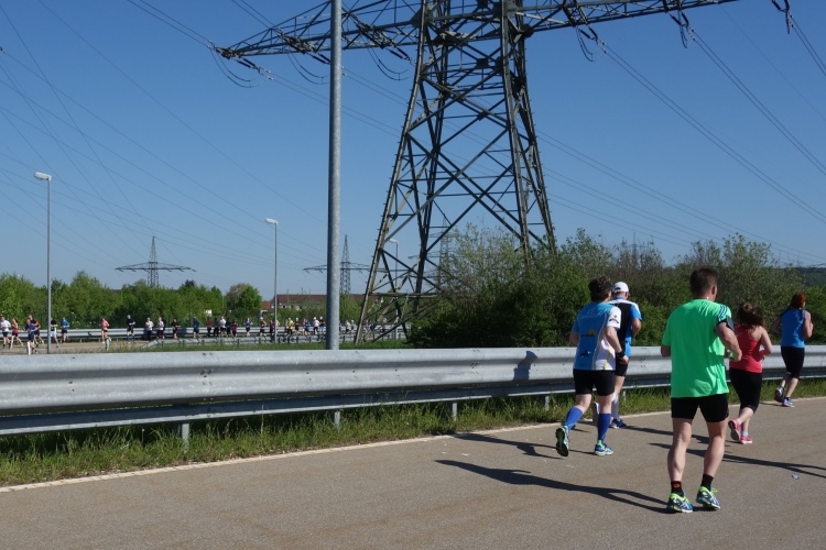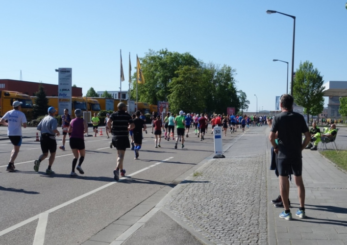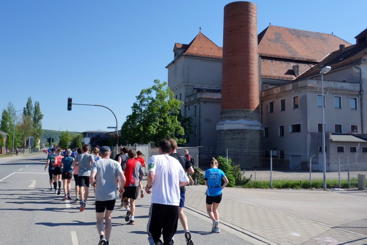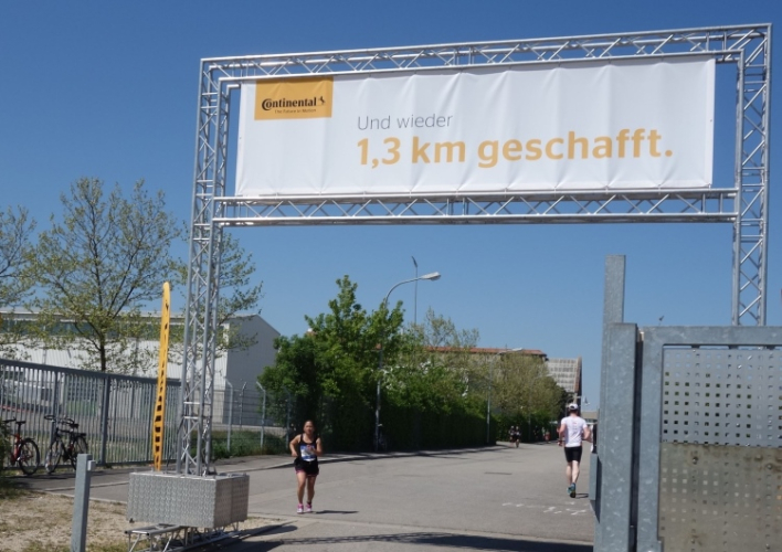 Es folgt ein von manchen sicher als schnöde empfundener Streckenabschnitt. Man kann hier aber auch beeindruckende Industriegebäude aus alten Zeiten sehen und dazwischen viel moderne Zweckarchitektur. Irgendwo müssen ja die Unternehmen der Sparten Automobil- und Maschinenbau sowie Elektrotechnik und Mikorelektronik hin, die in Regensburg für Arbeitsplätze sorgen. Wir besuchen jetzt erst einmal den Sponsor Continental, der hier neben Versuchslaboren auch eine Reifenteststrecke betreibt. Diese 1,3 Kilometer stehen heute uns zur Verfügung. In der Ferne kann man die Kräne am Osthafen erkennen. Die hier getesteten Reifen sind sicher nur für die Verwendung im Inland vorgesehen. Um beispielsweise italienische Straßen zu simulieren, fehlen hier eindeutig die Schlaglöcher. Spannend die Frage, ob dieser Lauf mein Konsumverhalten ändert. Aber bis zum nächsten Reifenkauf ist es hoffentlich noch einige Jahre hin. Dass ich aber endlich die Winterreifen wechsele, nehme ich mir an dieser Stelle fest vor.