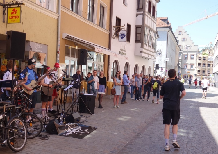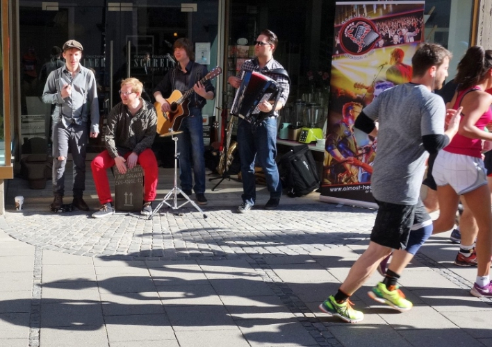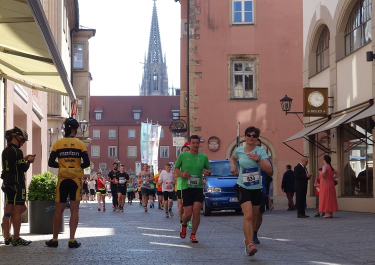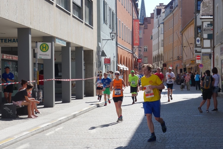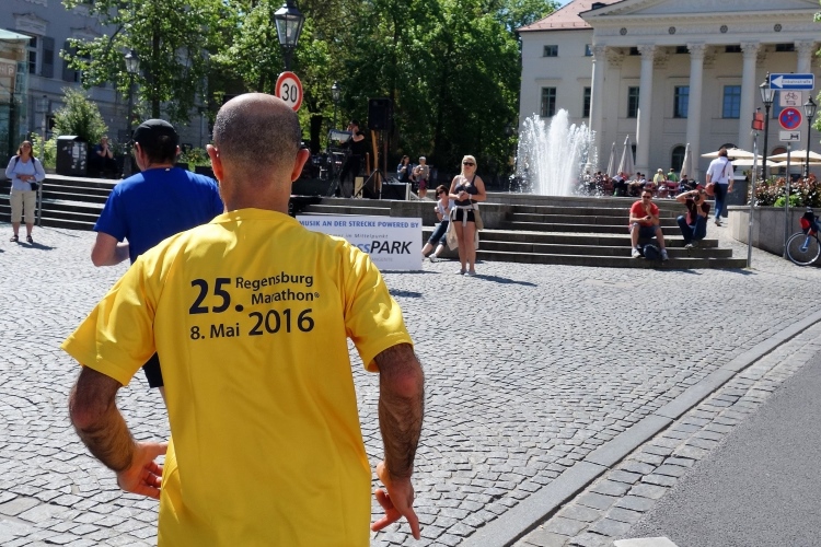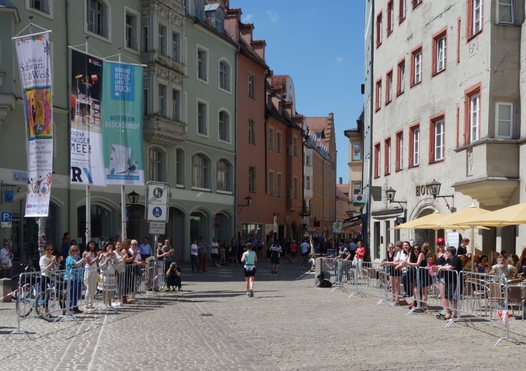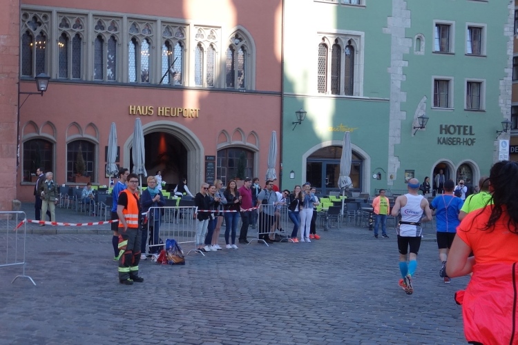 Vor uns das Alte Rathaus. Die vorher mobilen Reichstage fanden von 1594 bis 1806 immerwährend in Regensburg statt, so begeistert waren die Tagenden von der Stadt und dem Reichssaal. Ich freue mich da viel mehr über die fünfköpfige Kapelle "Ohne Franz", bevor es leicht bergab über den wichtigsten Platz der Stadt, den Haidplatz, geht. Auch hier einige Geschlechtertürme. Der Keyborder von "Eden Project" fordert mich freundlich auf, hier nicht rumzufotografieren, sondern endlich weiterzulaufen. Das nenne ich mal Anfeuerung.
