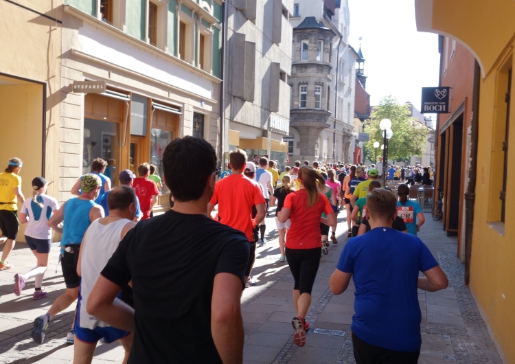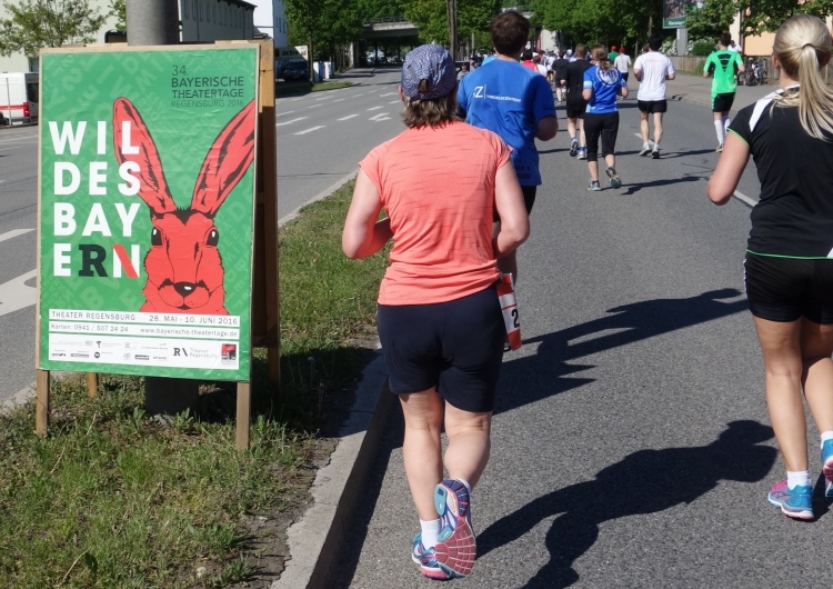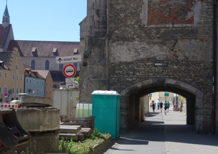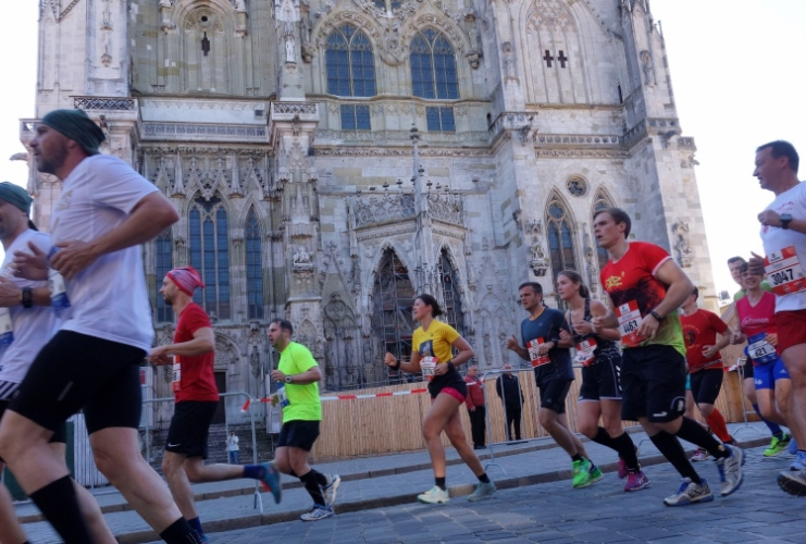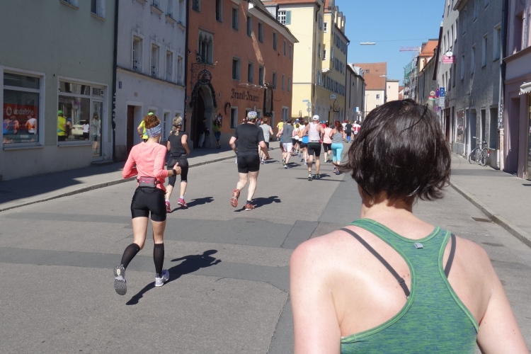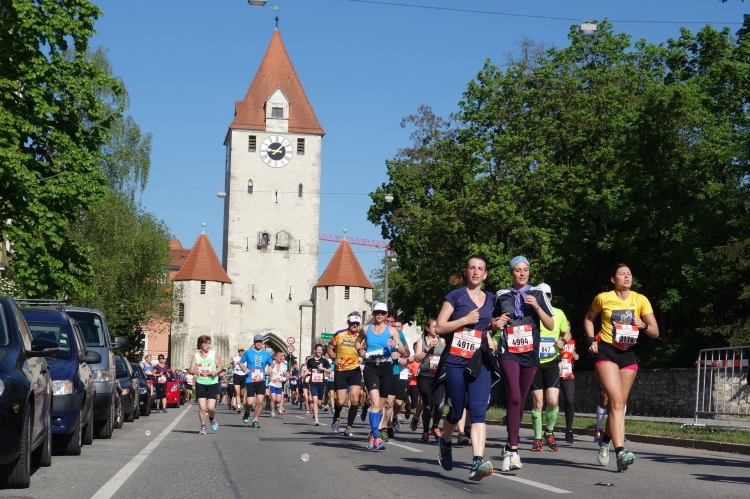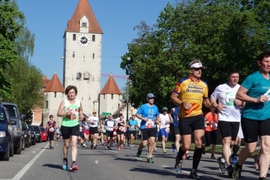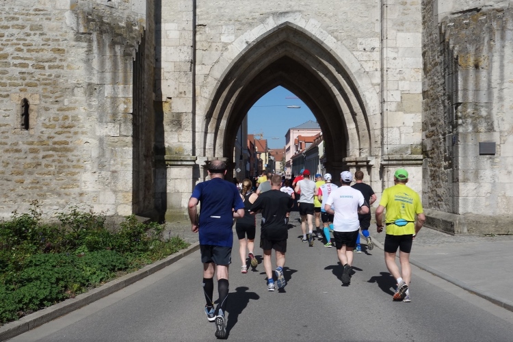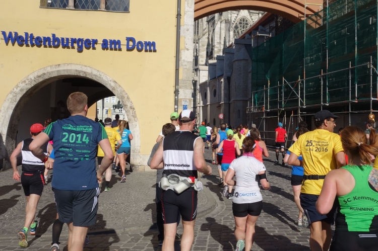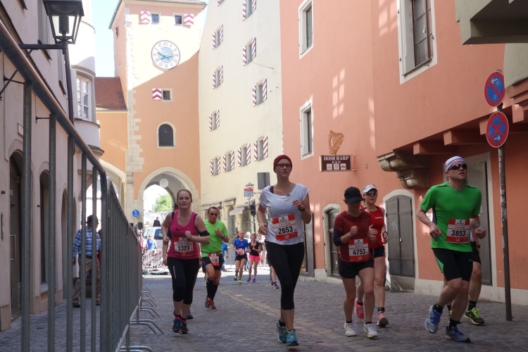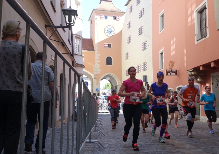 Der Westen wartet. Zurück auf die Straubinger Straße. Am alten Schlachthof ein großes Neubaugebiet. Regensburg boomt. Die Preissteigerungen bei Immobilien sind noch heftiger als in München. Da ist es nur folgerichtig, dass das Immobilienzentrum als Titelsponsor des Marathons auftritt. Das große Ostentor markiert den Beginn der mittelalterlichen Stadt. Ein gotischer Turm mit zwei achteckigen Flankentürmen. Gäbe es jetzt noch eine Zugbrücke, so wäre der Anblick perfekt.